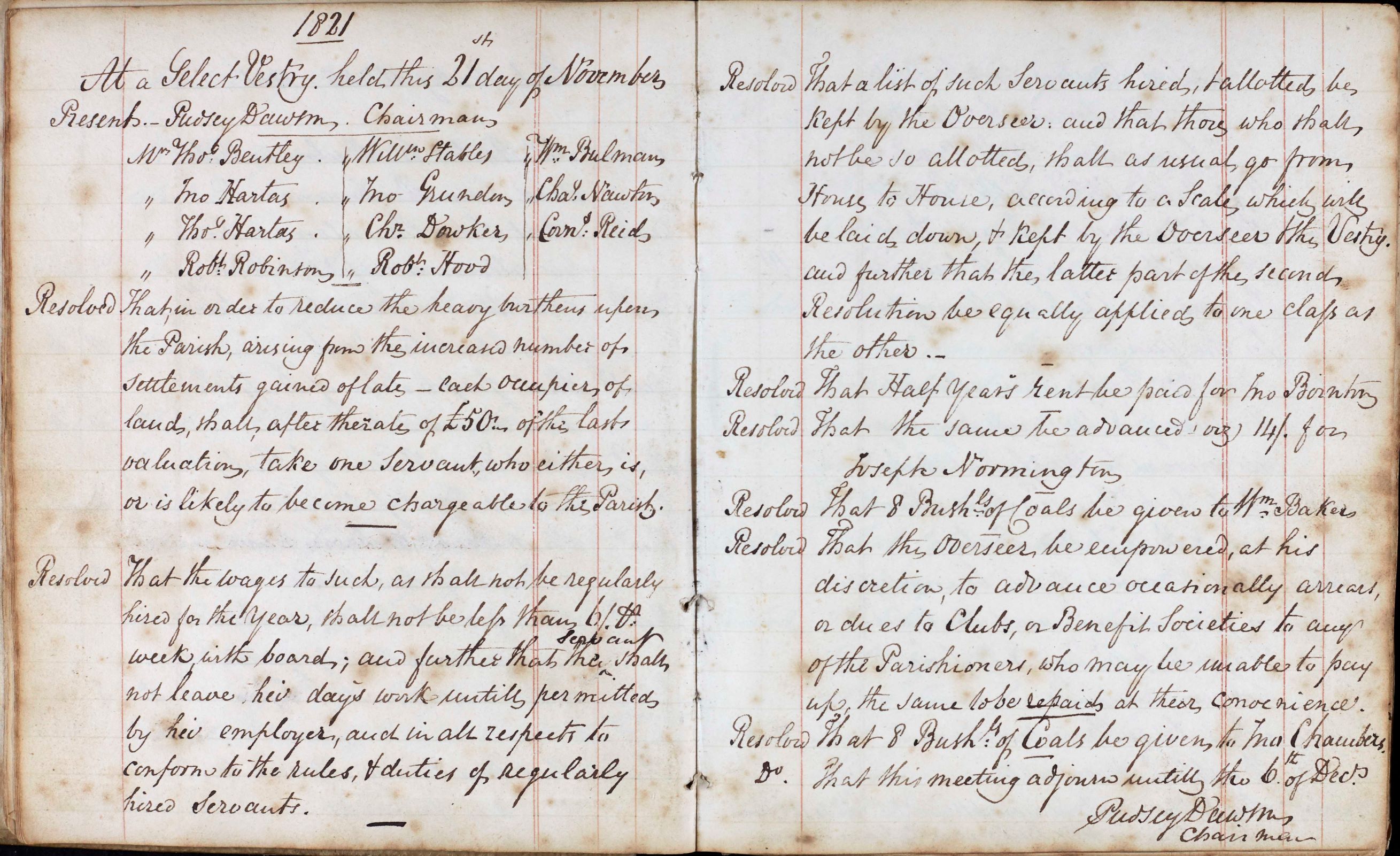 In November 1821, it was decided that in order to reduce the burden on the parish, each occupier of land should take one servant “who either is, or is likely to become, chargeable to the parish” for every £50 at which their land was valued. Wages were to be 6s a week with board. Those not allotted were to go from house to house.