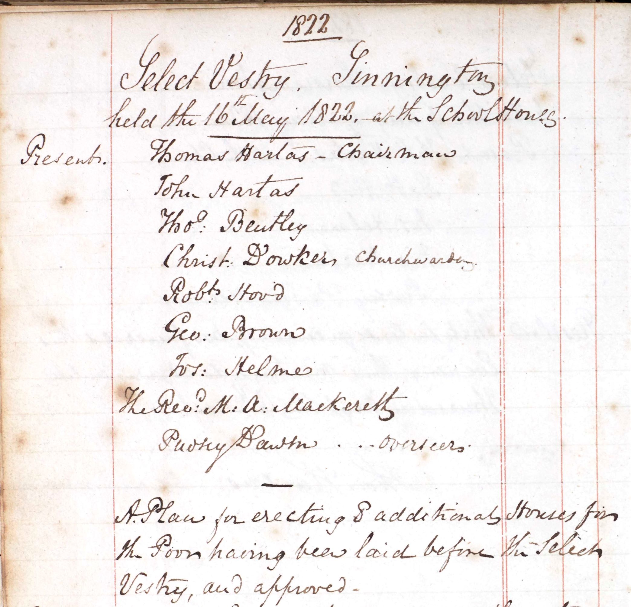 In May 1822, a plan for building eight additional houses for the poor was approved and estimates for undertaking the work were requested. The contract was awarded to a William Smith of Marton, who was paid 100 guineas in September of that year with more to follow.