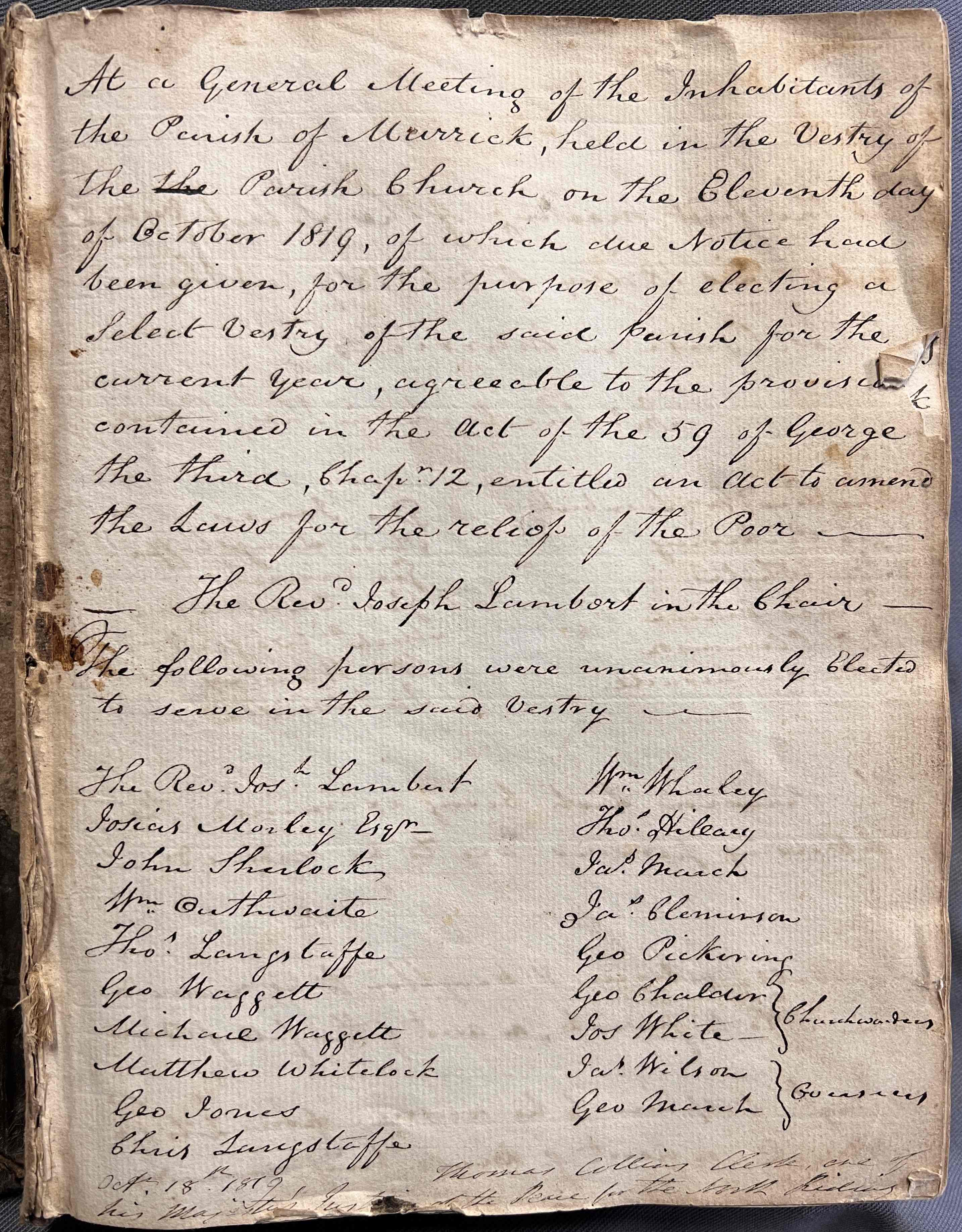 PC/MAR 1/1 , Opening page of minute book, recording the names of those elected to form the select vestry, 8 November 1819