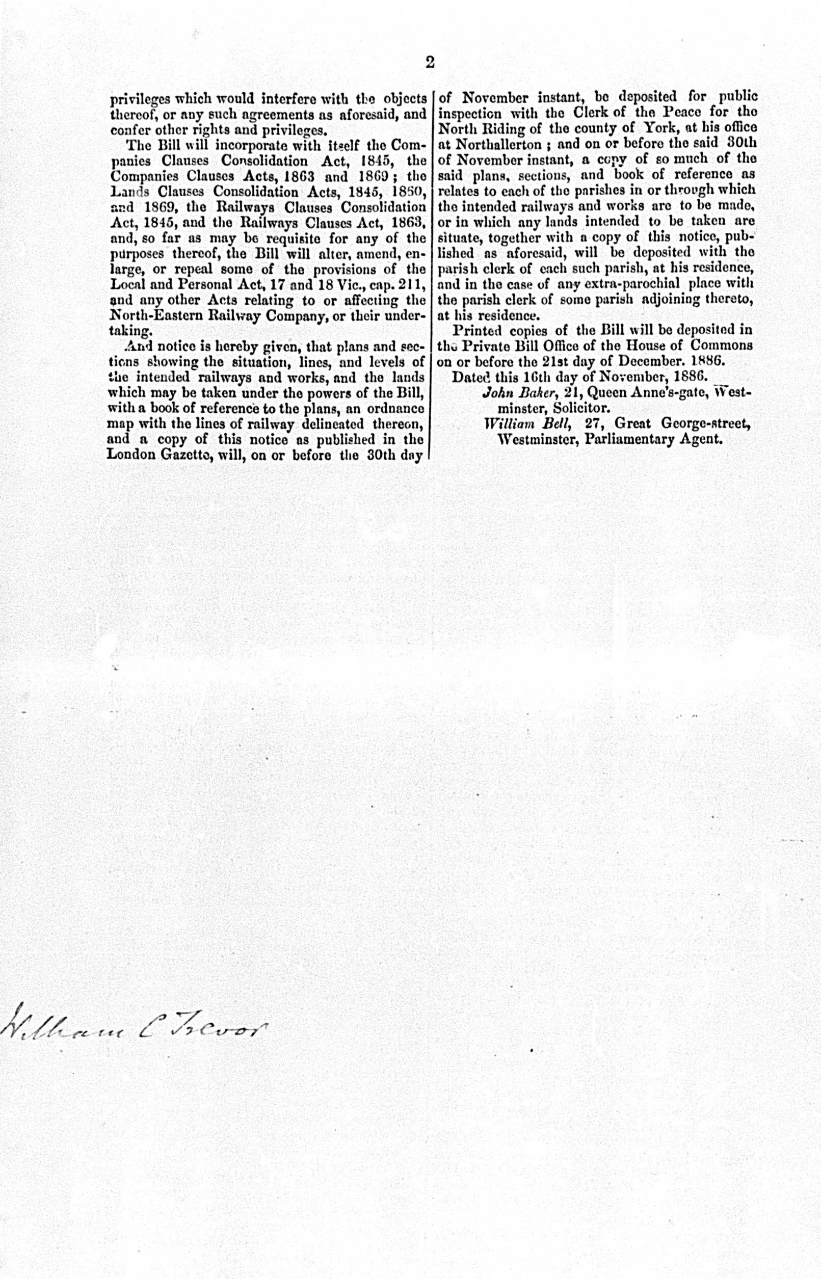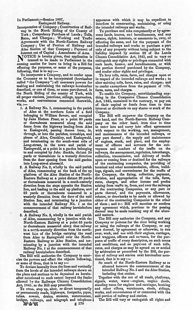 Pages from the Easingwold Railway Book of Reference, November 1886, including notice that application is intended to be made to Parliament in the ensuing session [1887] for leave to bring in a Bill for the incorporation of the Easingwold Railway Company and for construction of the Railway &c [QDP M257]