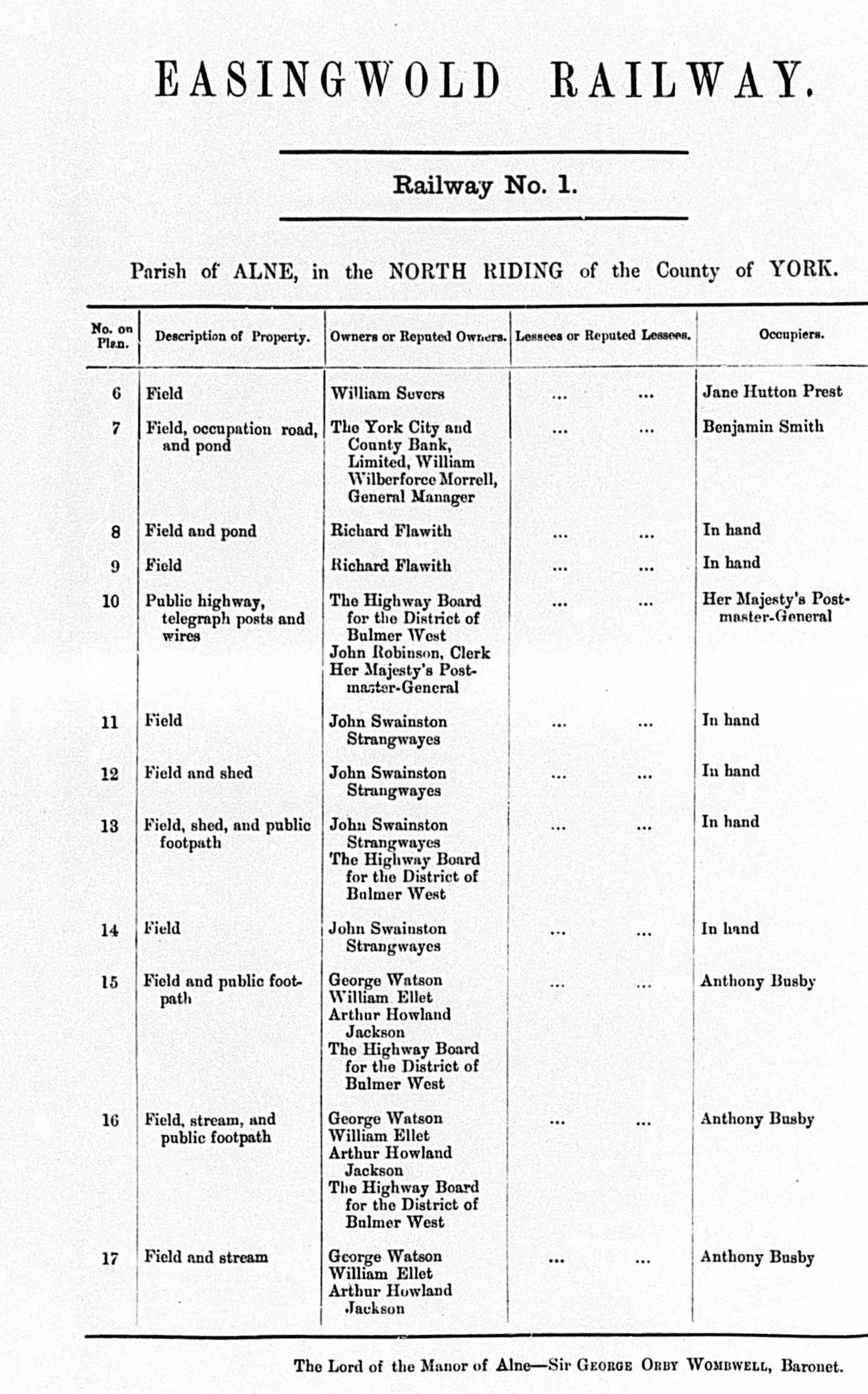 Pages from the Easingwold Railway Book of Reference, November 1886 identifying all owners, lessees and occupiers with a qualifying interest in land and property affected by the railway scheme [QDP M257]