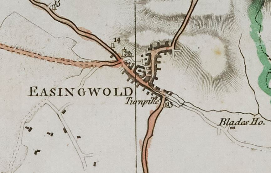 On large, county-wide maps such as this, the mapping is not sufficiently detailed to rely on for accurate depictions of individual buildings. However, in this representation of Easingwold, the settlement and the church are clearly visible, as is the triangular road layout.