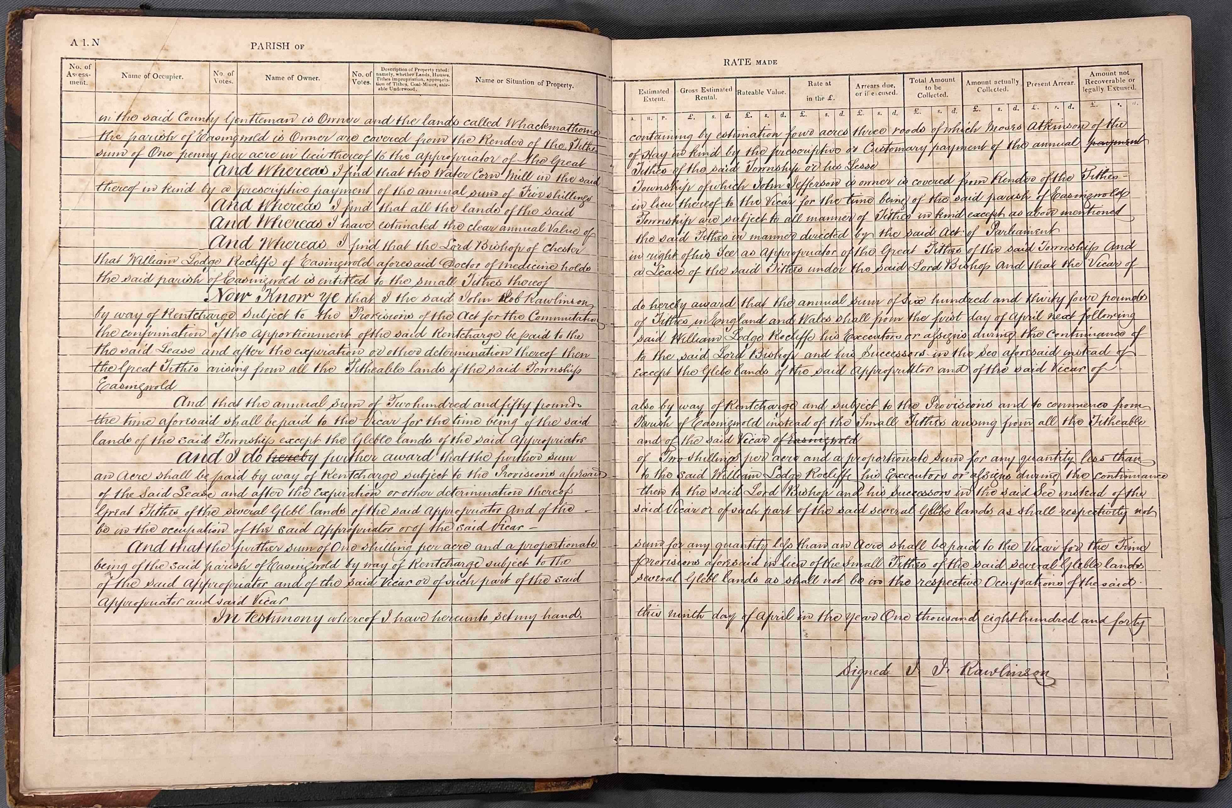 Examples of pages from the copy of the Easingwold tithe apportionment of 9 April 1840, including the four-page introduction, handwritten into a pre-printed, bound rate book.