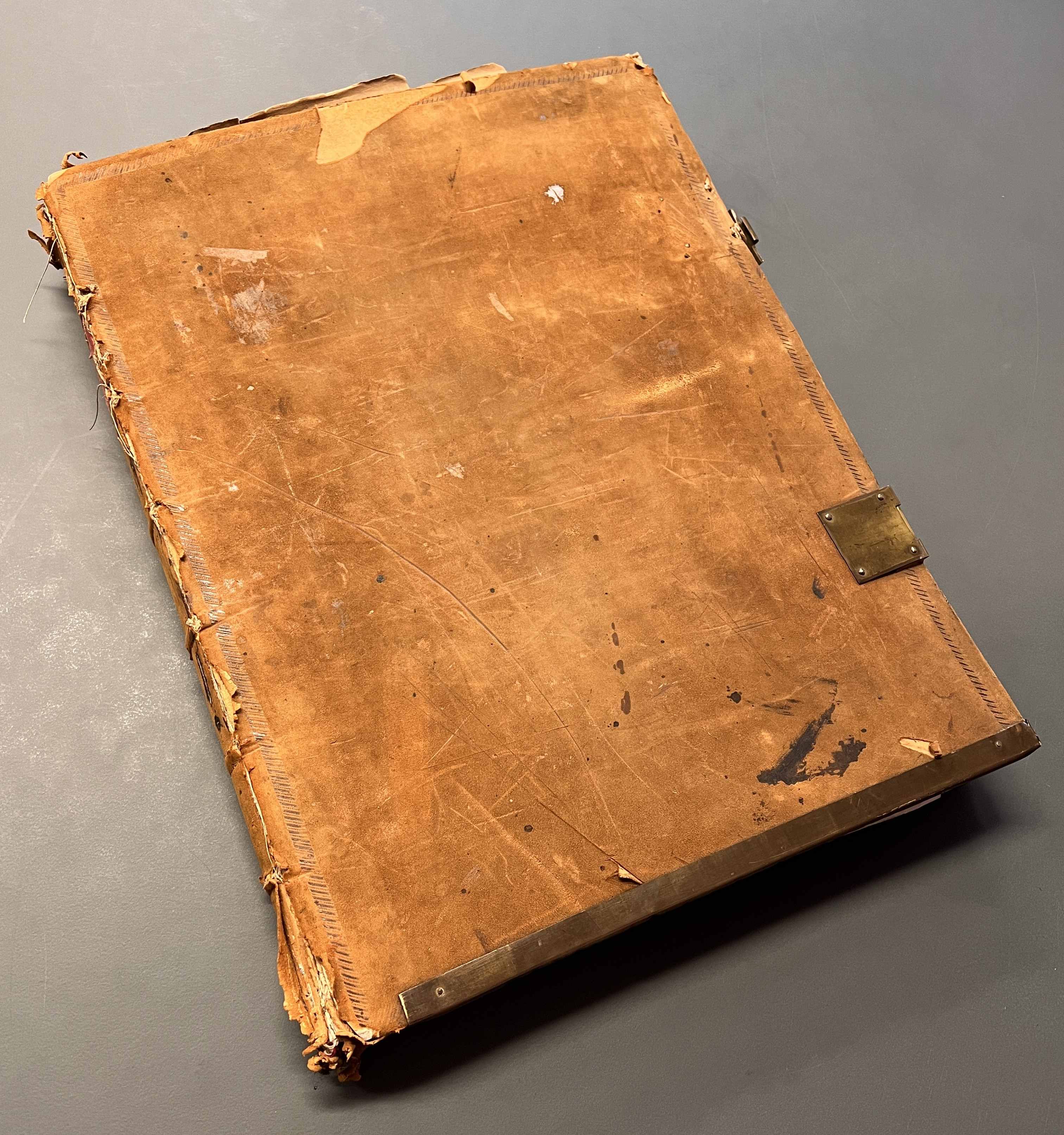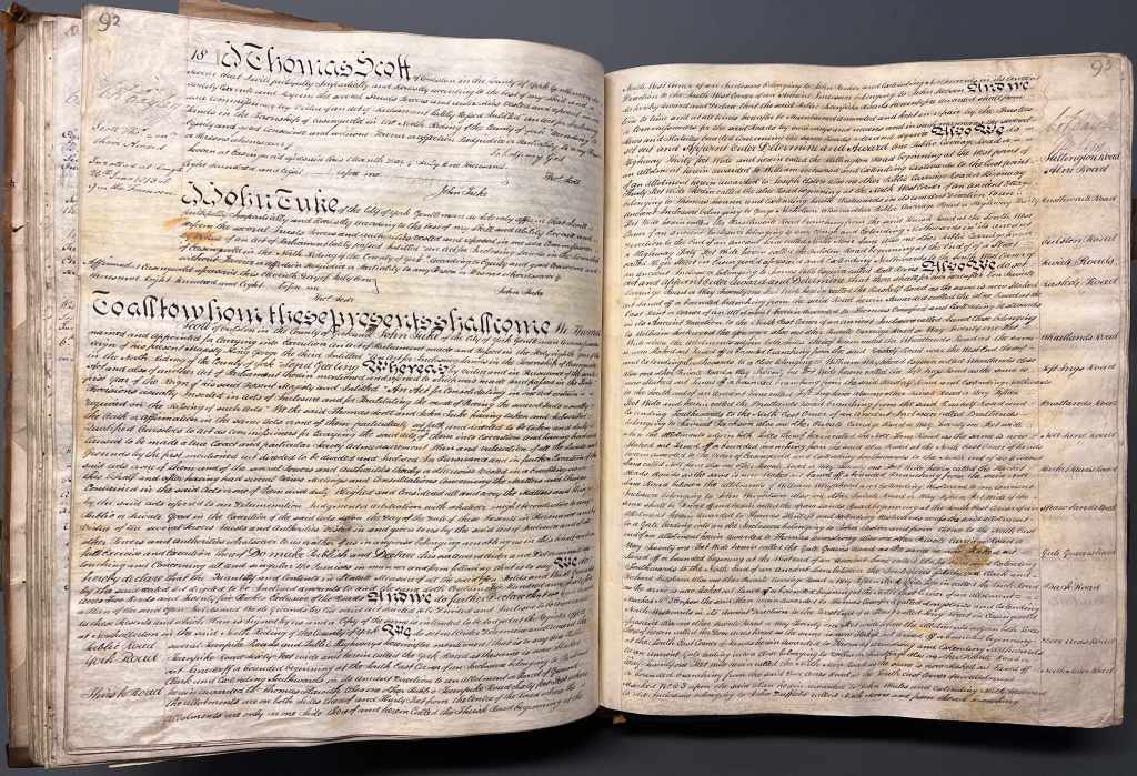 There are two copies of the enclosure map and related award within Record Office collections, one set as part of the Easingwold Parish Council records, the map being drawn on parchment and measuring 43 x 37 inches [PC/EAW]. The other copy was enrolled within the North Riding Register of Deeds, the award written into one of the large, leather-bound Register volumes [NRRD DO/18/92-124, see images below]. The accompanying map was drawn on paper on linen, measuring 37 x 40 inches [NRRD no.14, see image above]. Under the title in the top left corner, this plan is signed on 12th November 1812 by the two Enclosure Commissioners, Thomas Scott and John Tuke. The ‘Remarks’ in the top right corner note the following colour conventions: