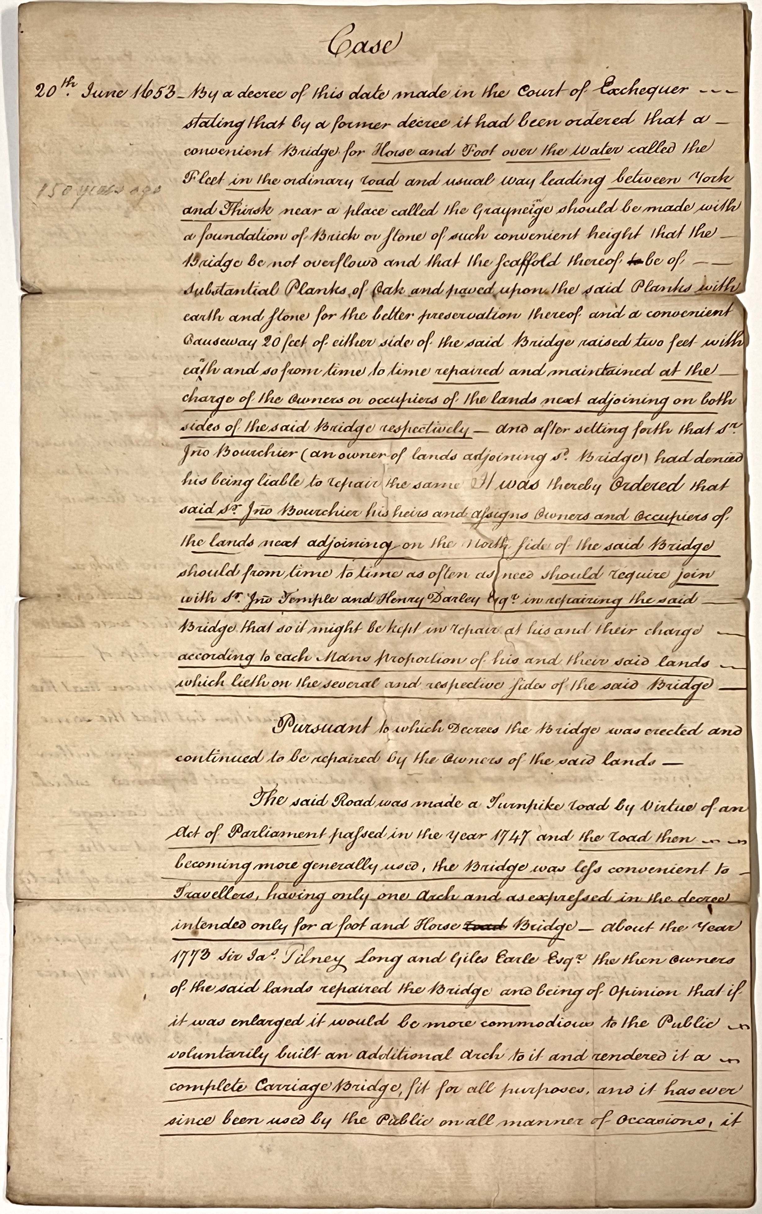 “the road then becoming more generally used, the Bridge was less convenient to Travellers, having only one arch and as expressed in the decree intended only for a foot and Horse Bridge. About the year 1773 Sir Ja[me]s Tilney Long and Giles Earle Esqr. the then owners of the said lands repaired the Bridge and being of opinion that if it was enlarged it would be more commodious to the Public voluntarily built an additional arch to it and rendered it a complete Carriage Bridge fit for all purposes and it has ever since been used by the Public on all manner of occasions it being on the High Turnpike road between York and Easingwould and not a more Public Bridge between London & Edinbro’“.