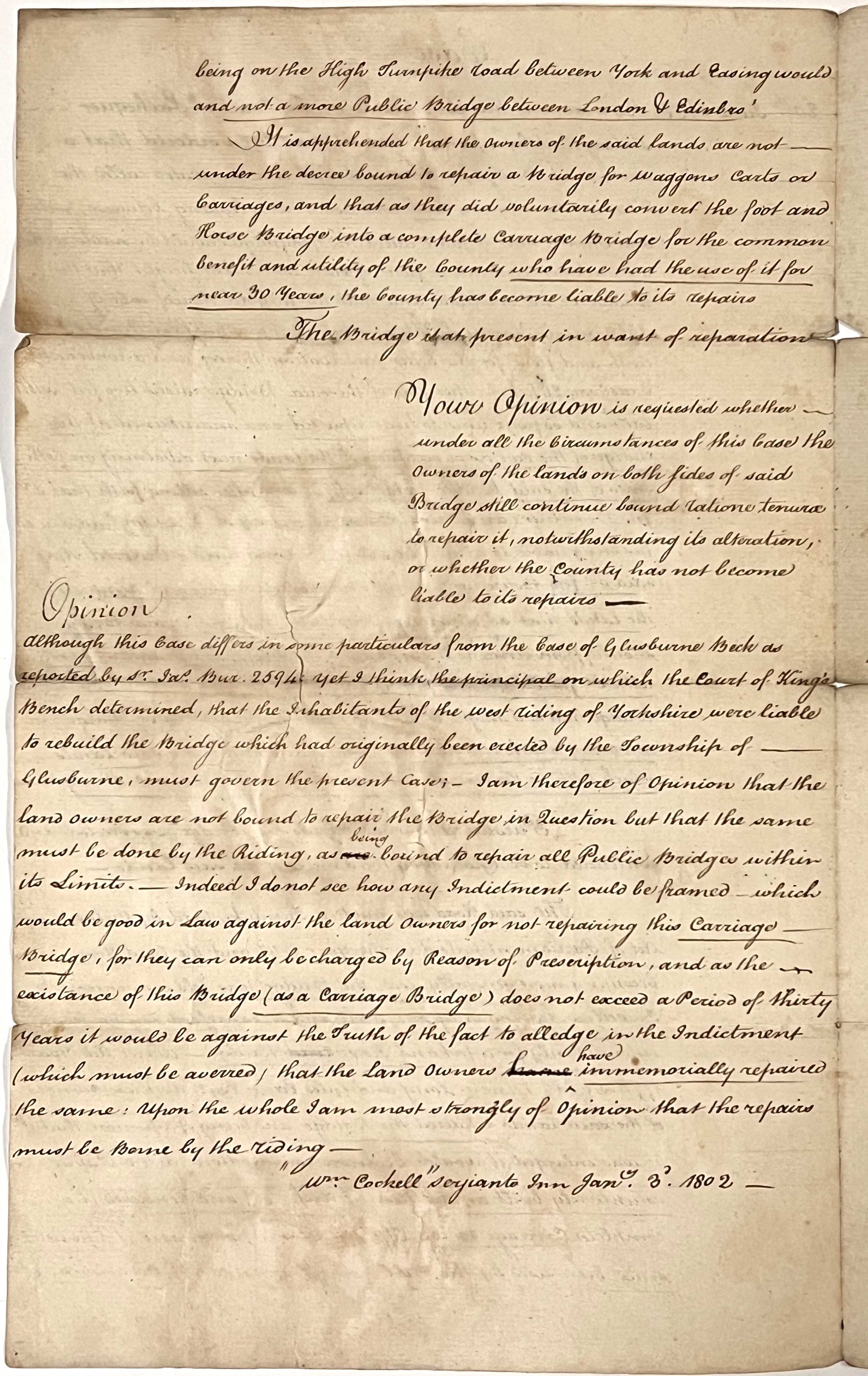 By 1802, after the bridge had been upgraded and subsequently used for common benefit for a period of nearly thirty years, the opinion of William Cockell, of Serjeant’s Inn (in the City of London), was that the landowners should no longer be held liable for repairs and instead, the responsibility should lie with the North Riding:
