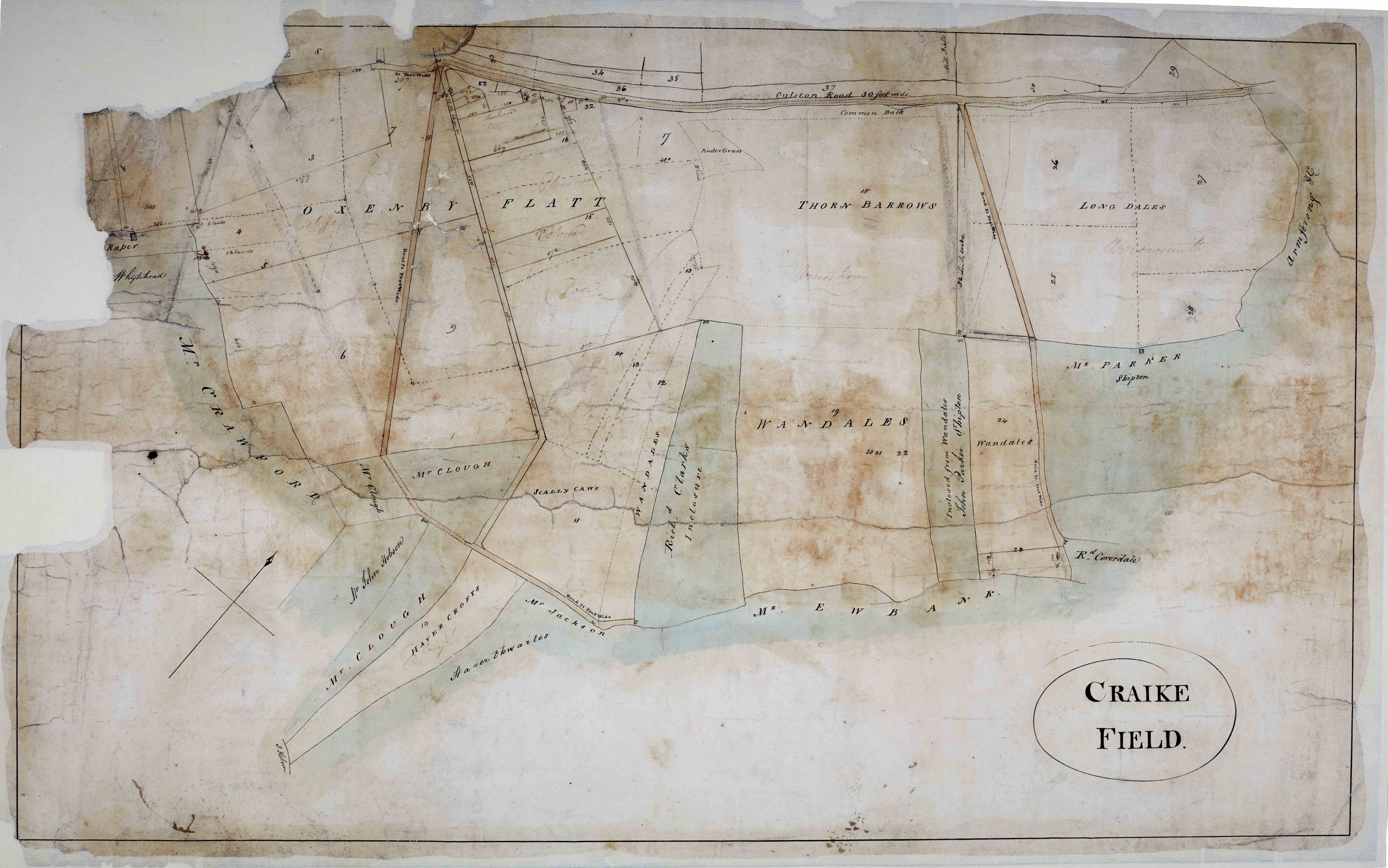 The nine YAHS plans referred to above are drawn at the same scale of three chains to one inch as the five plans held by the Record Office and depict the same fields. The nine plans are in two groups, thought to have been made about ten years apart, and they appear to be more detailed, showing individual strips and furlongs, which are named and numbered within each field, and some are coloured. One of the plans of Craike Field from the earliest group is dated May 1796 and there is a clue to the cartographer on the early Church Field map on which is noted ‘W Lockwood delin’ (drawn by W Lockwood) (Kirk ed. 1996, pp.113-114).