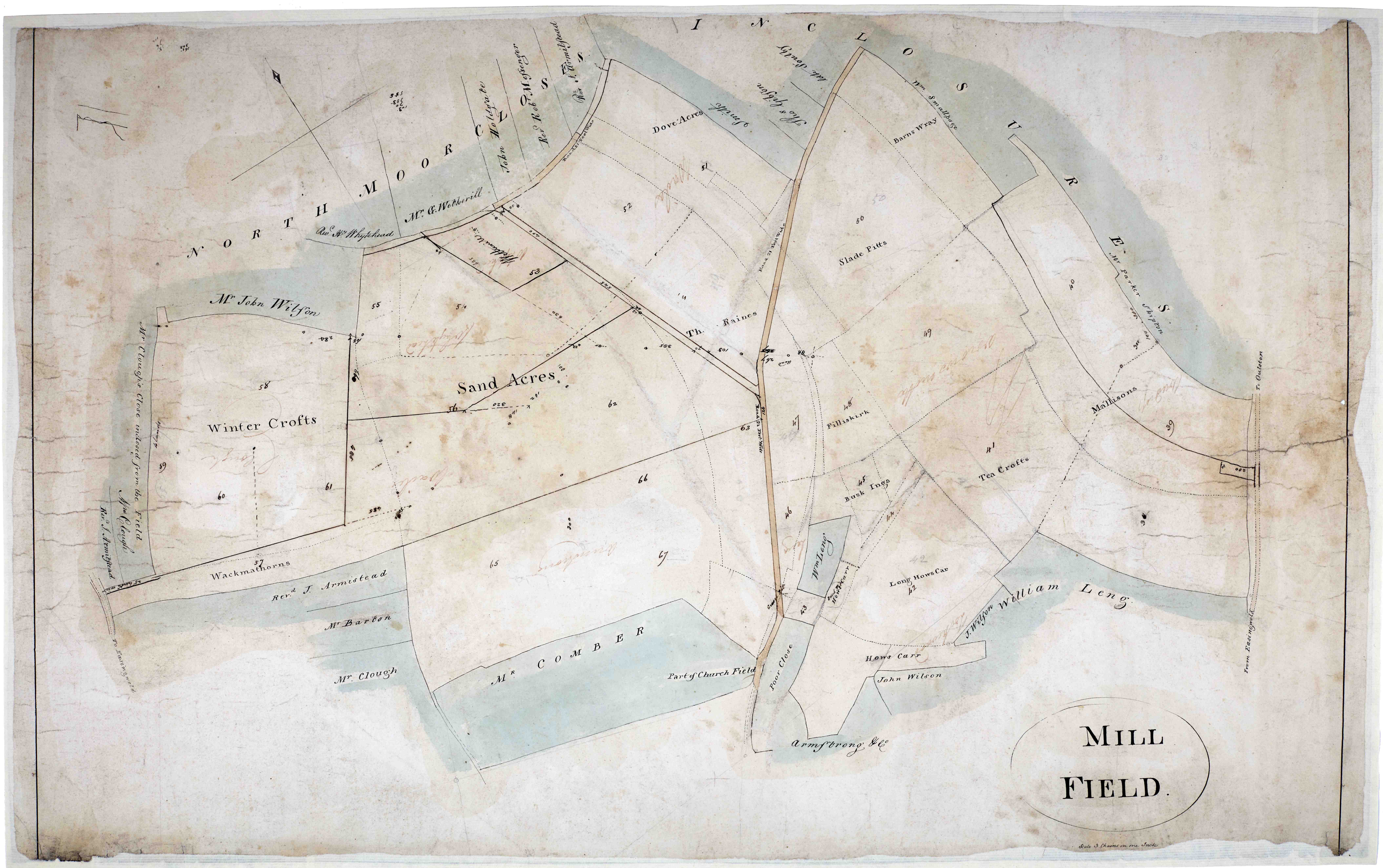 Some of the roads are named and their widths noted in feet. There are also various other measurements, field numbers, field names and personal names written on the plans, plus references to ‘old inclosures’. This suggests that the plans are concerned with the reorganisation of the landscape surrounding the town as part of the enclosure of the former, medieval open fields, when individual strips were consolidated into new fields, and new boundaries and roads laid out, a process that was taking place at the beginning of the 19th century (see below). The names of the open fields are still noted on the later, first edition Ordnance Survey map of 1856 (Yorkshire sheet 121), which helps to identify their location relative to the area of settlement (see below).