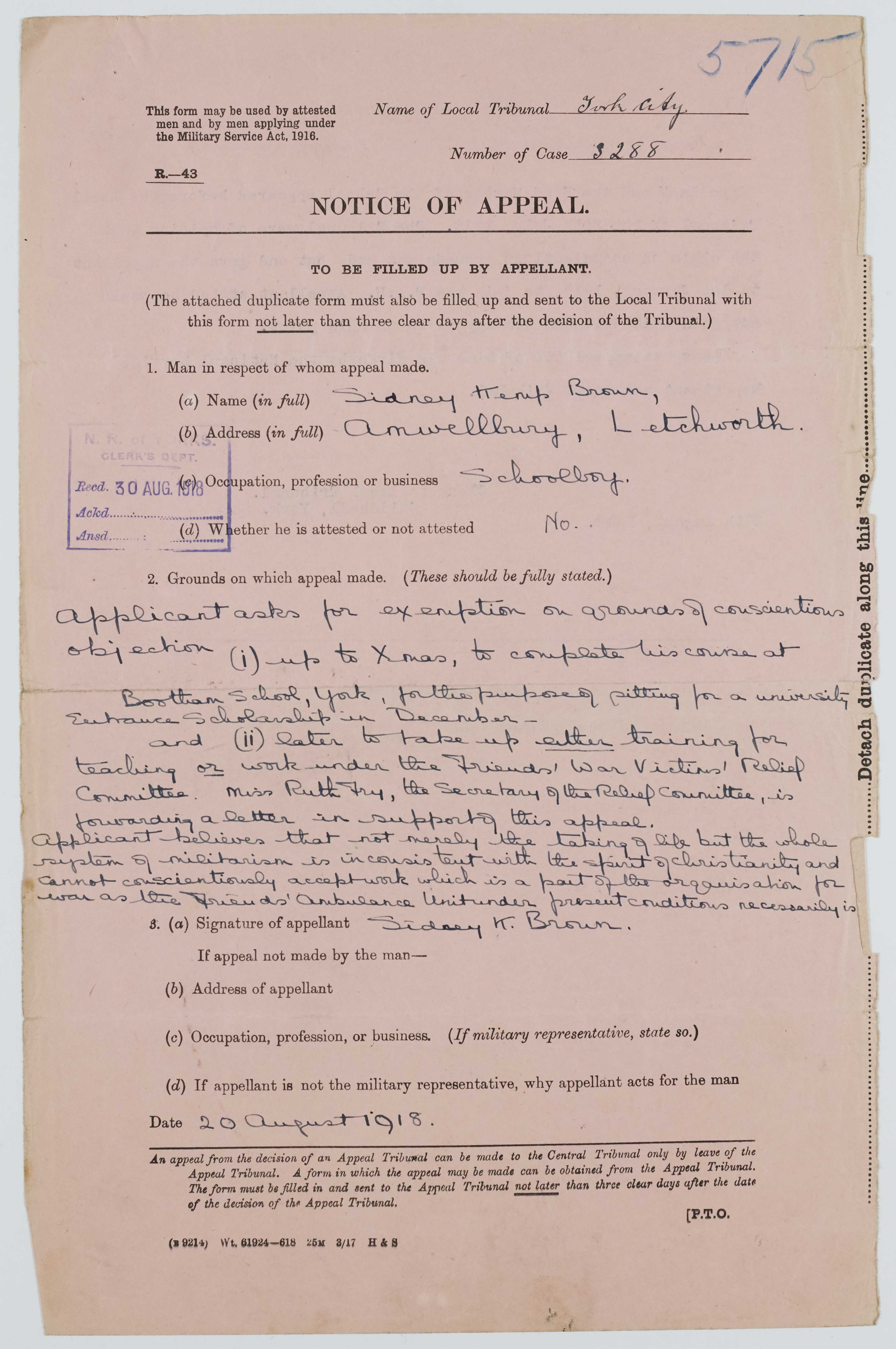 A selection of the WWI Appeal papers of Sidney Kemp Brown of York [NRCC/CL 9/1/5715]