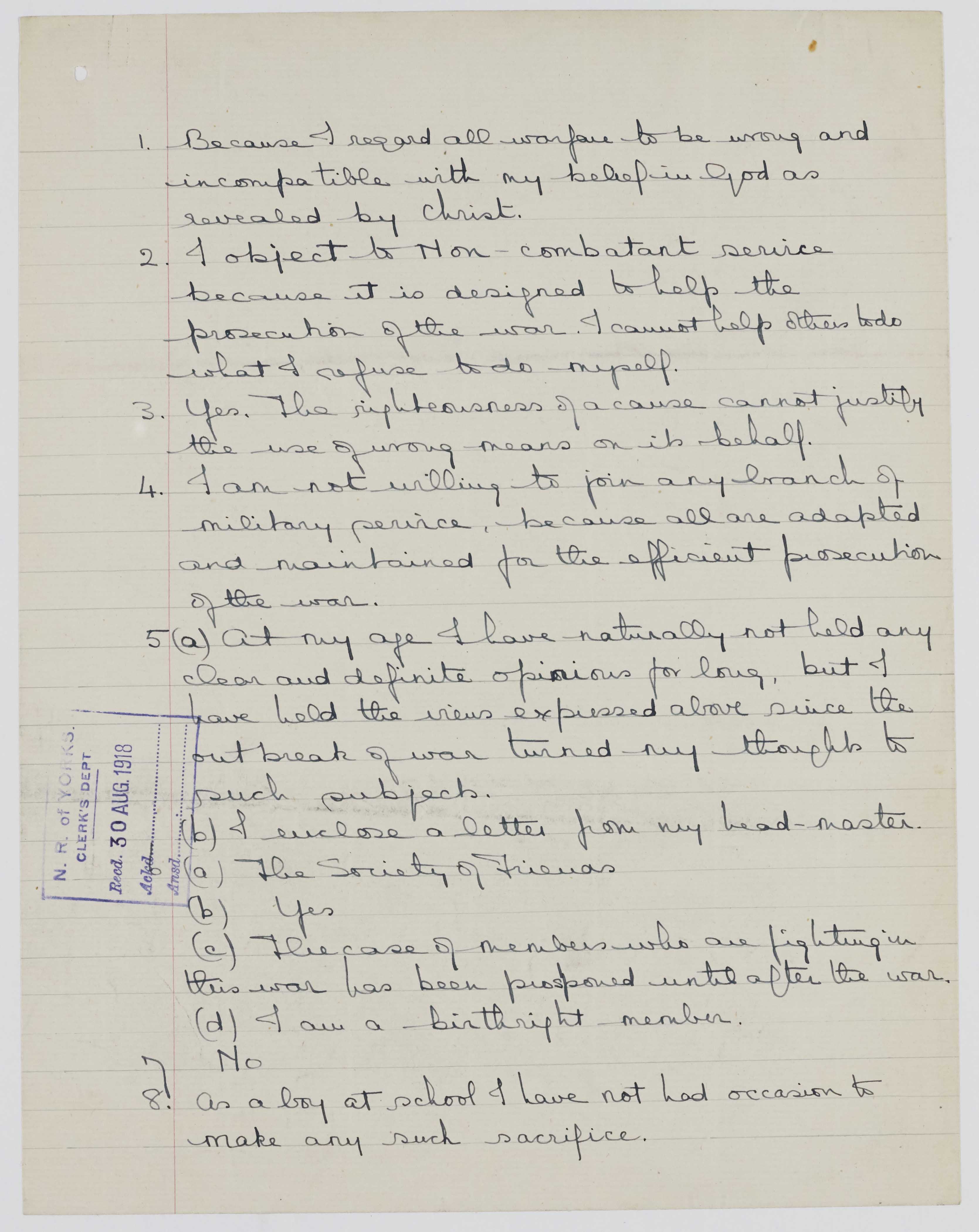 The North Riding Military Tribunal Papers (1916-1918) contain some appeals against WWI conscription on conscientious grounds – including that of Sidney Kemp Brown, age 17, whose Quaker faith meant he was strongly anti-war and anti-combatant. Refusing even to join the Friends’ Ambulance Unit, it was eventually decided he could assist with the Friends’ War Victims’ Relief Committee work in France, helping civilian refugees of war.
