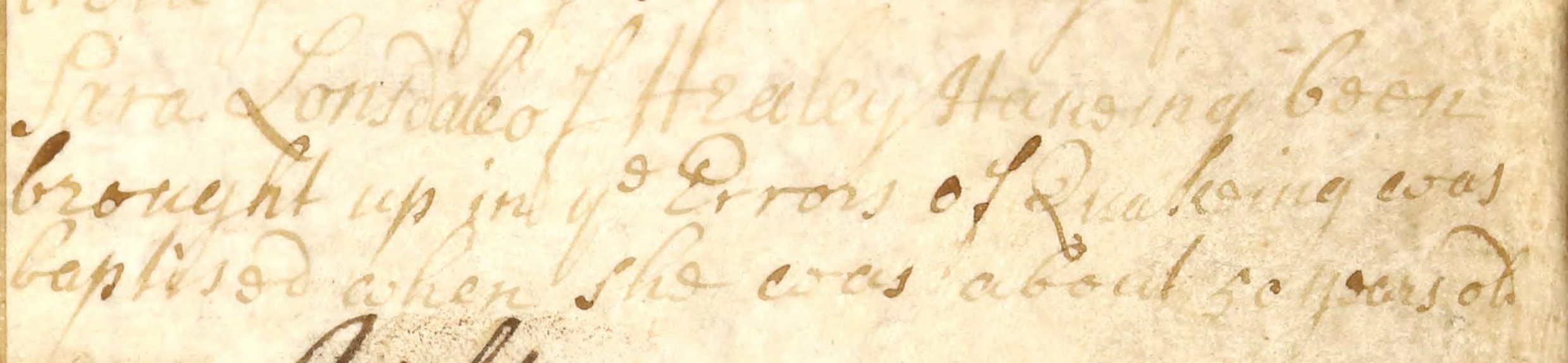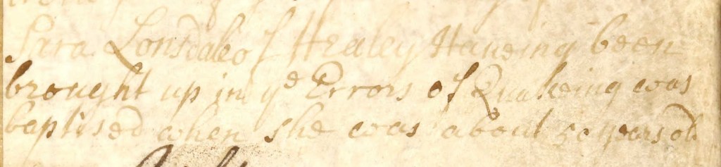 Until the Toleration Act of 1689, Quakers were obliged to be baptised, married, and buried in their parish church. They can therefore appear in the Anglican parish registers – though not necessarily in a complimentary manner! Sara Lonsdale was baptised when aged about fifty, at Grinton parish church in 1721, the clerk noting she’d been “brought up in the errors of Quaking”.
