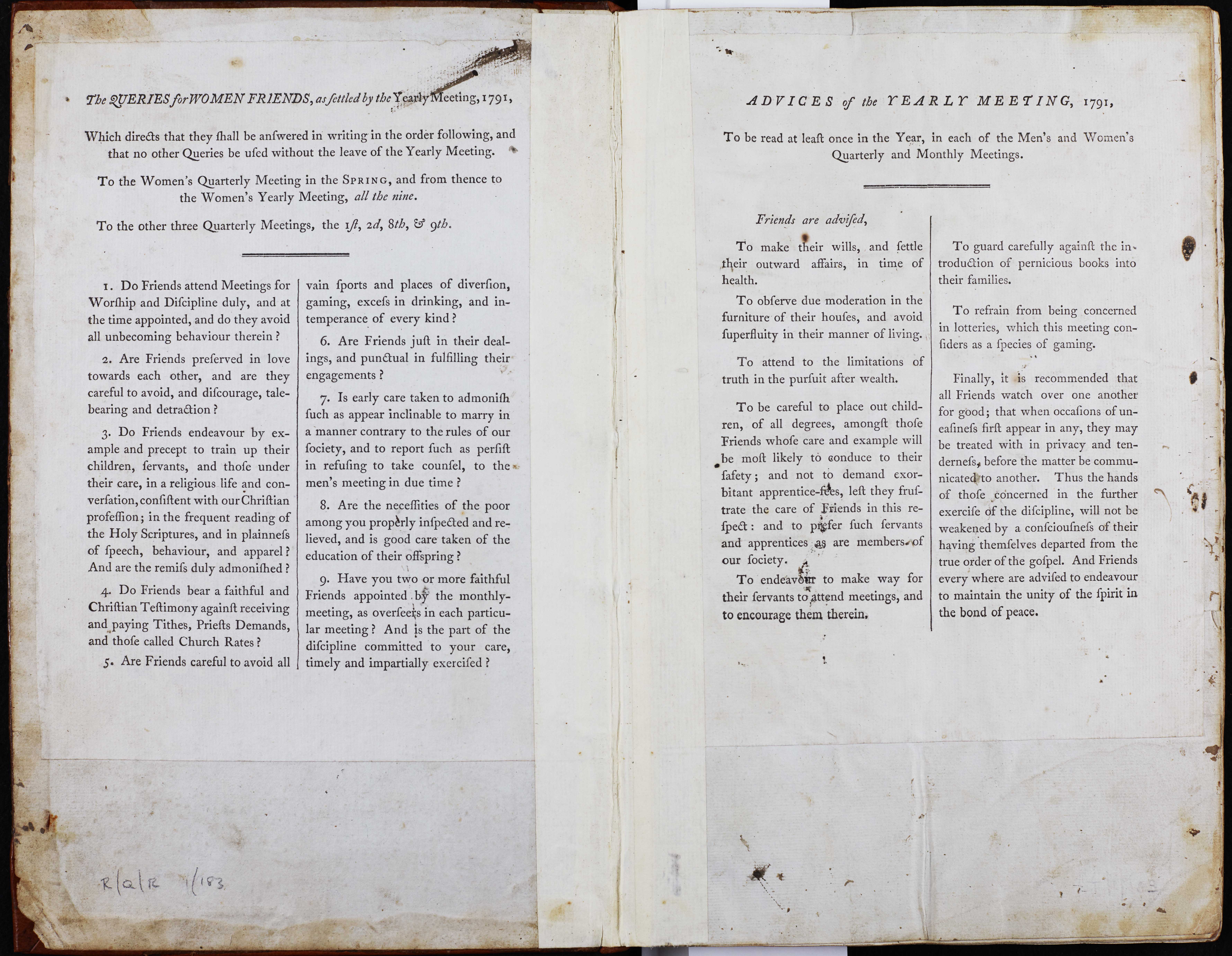 - Right: ‘Queries and Advices from the Yearly Meeting, 1791’, saved in Richmond Monthly Meeting Minutes [R/Q/R 1/183]