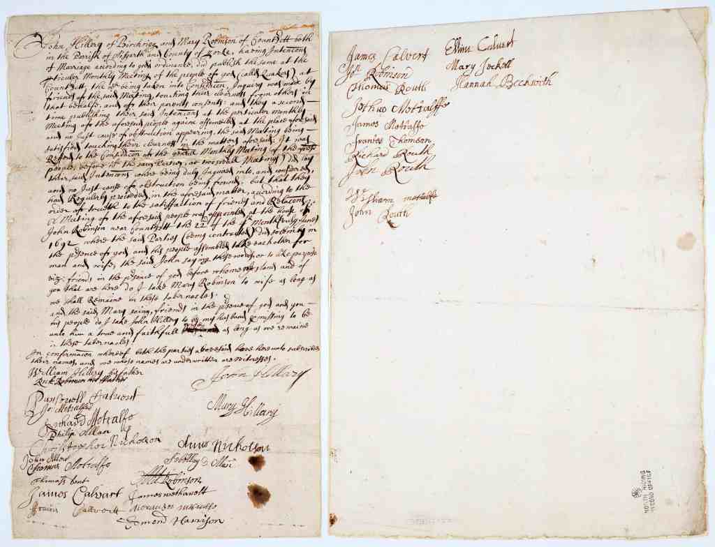 Marriage certificate of John Hillary of Birchrigg and Mary Robinson of Countersett, Aysgarth, 1692 [R/Q/R 11/1]