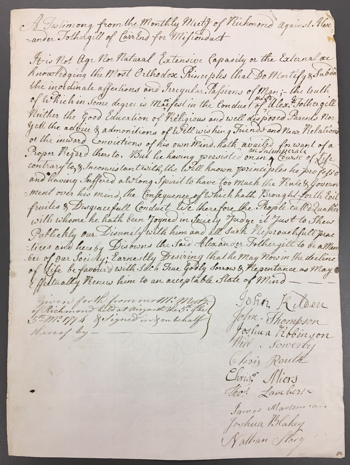 Central to the personal and public lives of Quakers is acting with conscience. So important is this, that records from the 17th and 18th-centuries reveal that Friends found transgressing prescribed moral boundaries could find themselves publicly disowned based on testimonies issued against them by fellow Quakers. Though an extreme measure, disownment was only a last resort, after all attempts at conciliation were exhausted. The Richmond Monthly Meeting collection contains a bundle of testimonies spanning the dates 1770 to 1835, dealing with a wide range of perceived misconduct, including gambling, debt, business mismanagement, clandestine marriage and licentious behaviour.