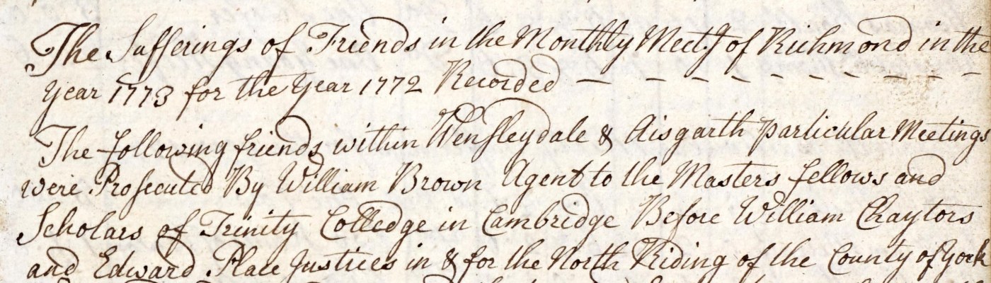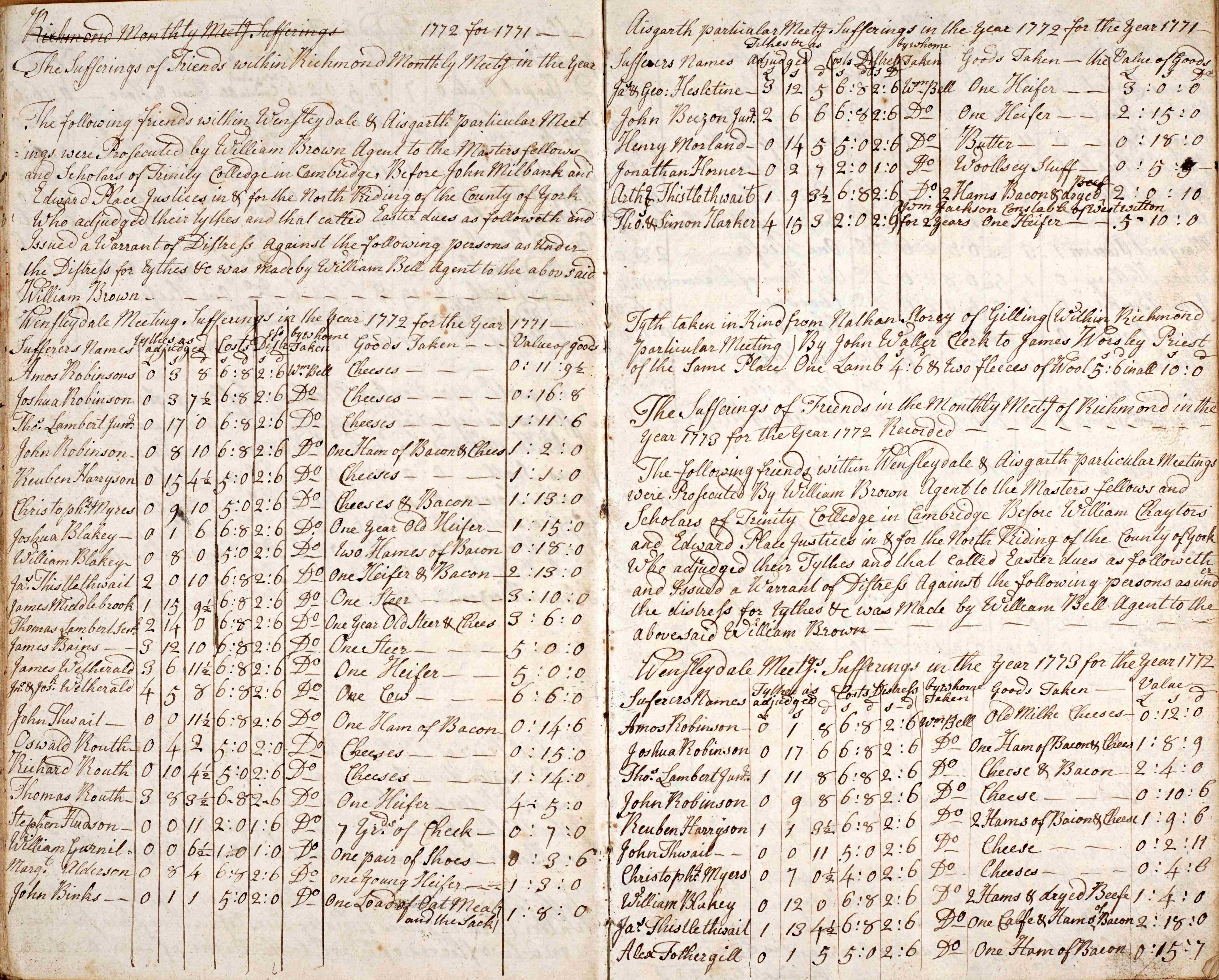 Sufferings are records detailing wrongdoings and distraints against Friends by non-Quakers. Instances can appear in minutes of Meetings and in personal correspondence, but specific registers were also kept. Annual returns of sufferings were compiled by Quarterly Meetings and sent to the Yearly Meeting. The bulk of sufferings’ entries relate to punishments for non-payment of church rates and tithes, and further refusal to pay any subsequent fines imposed. Determined that Quakers would pay, the established church and court officials organised the seizing of non-payers’ goods in lieu of payment. Examples show anything and everything could be taken – usually amounting to more than the value of actual tithe amount due. Wider sufferings were also acknowledged, for example that of enslaved people.