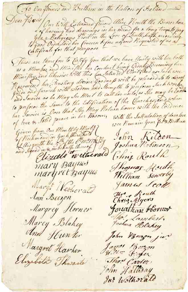 Quakers who were inspired to travel (often far) from home for ministering purposes were granted certificates of good character and introduction by their Monthly Meeting – as in the case of Alice Routh, a member of Richmond Monthly Meeting, who had “drawings in her mind” to pay other Quaker communities religious visits, including to Ireland in 1772.