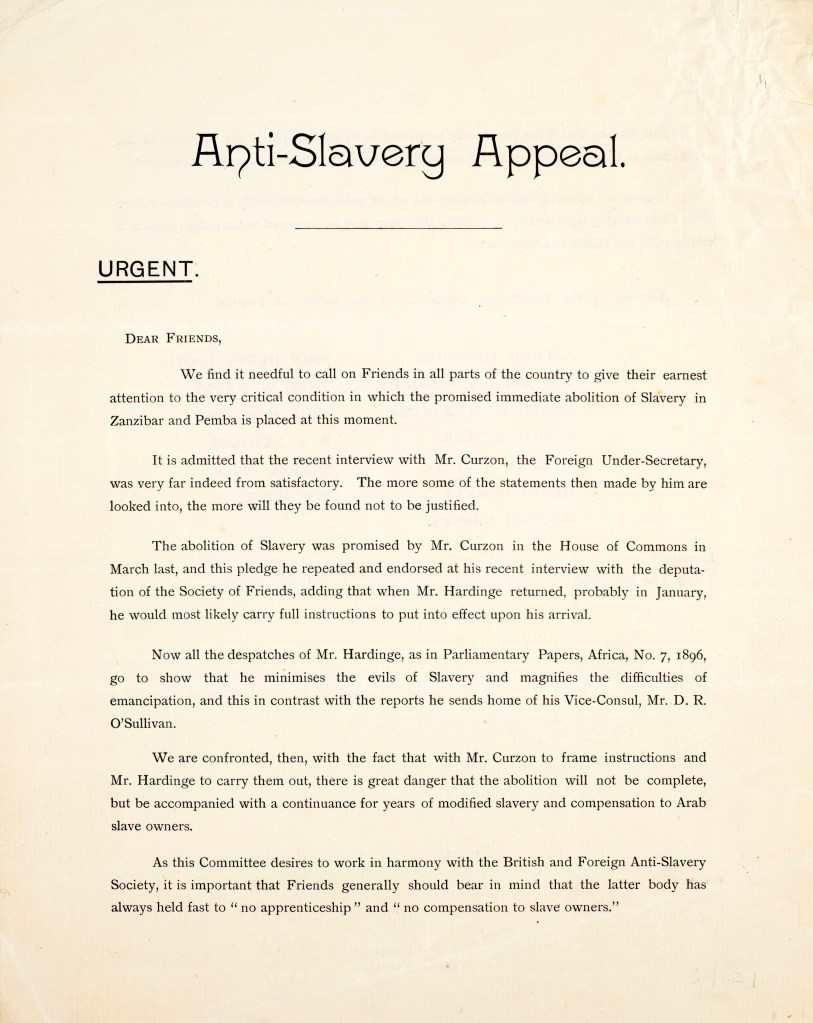- Anti-Slavery Appeal, Zanzibar, 1896 [R/Q/R 7/278]