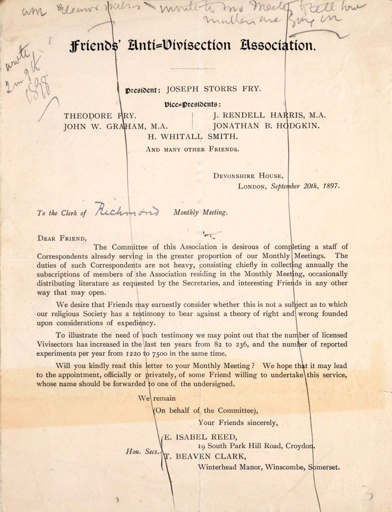 - Letter from the Friends’ Anti-Vivisection Association to Richmond Monthly Meeting, 1897 [R/Q/R 7/289]
