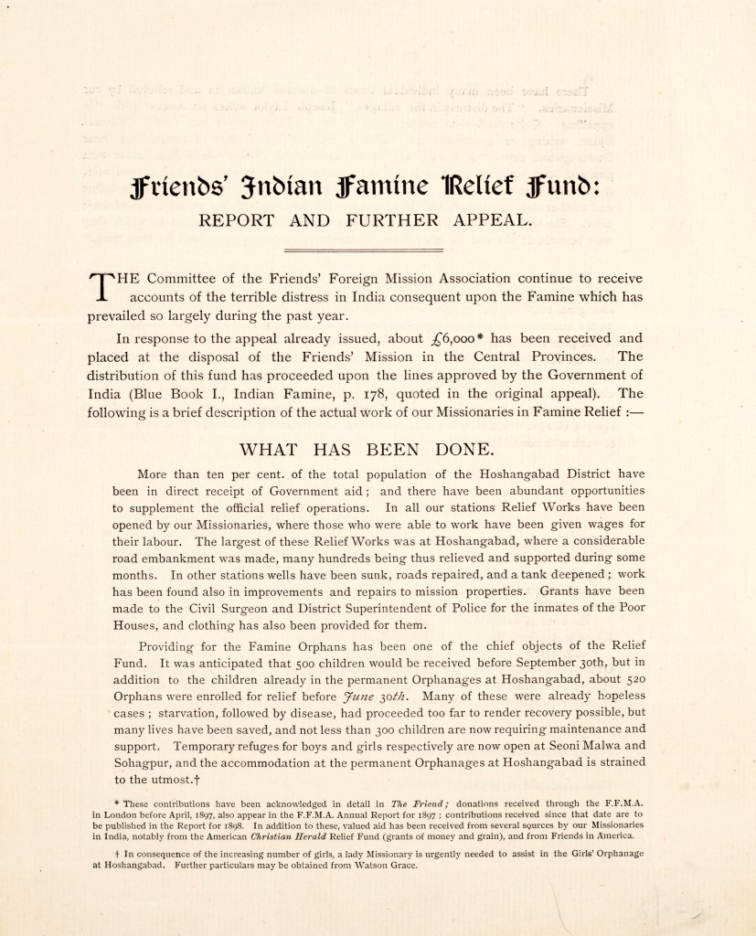 - Friends’ Indian Famine Relief Fund: Report & Further Appeal, 1897, page 1 [R/Q/R 7/291]