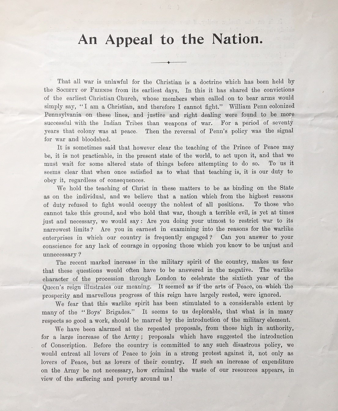 Quakers regard war and other violent action as unlawful. Printed circulars contained in the Richmond Monthly Meeting correspondence and papers show Friends at various times joined and organised campaigns in support of peace, and against army enlargement and military conscription.