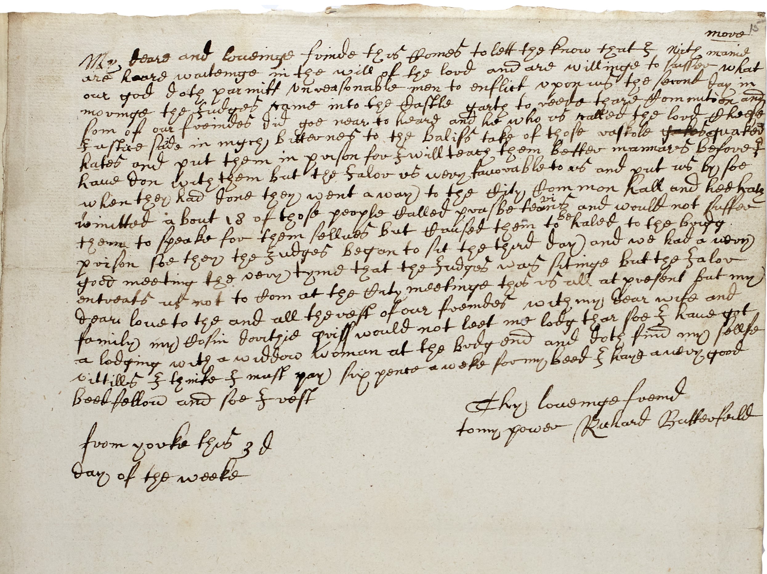 Letter from Richard Butterfield at York to Phillip Swale, July 1684, describing how the visiting Lord Chief Justice to York Castle forced Friends to remove their Quaker hats and ordered the gaoler to: “put them in prison for it will teach them better manners before I have done with them” [R/Q/R 9/345]
