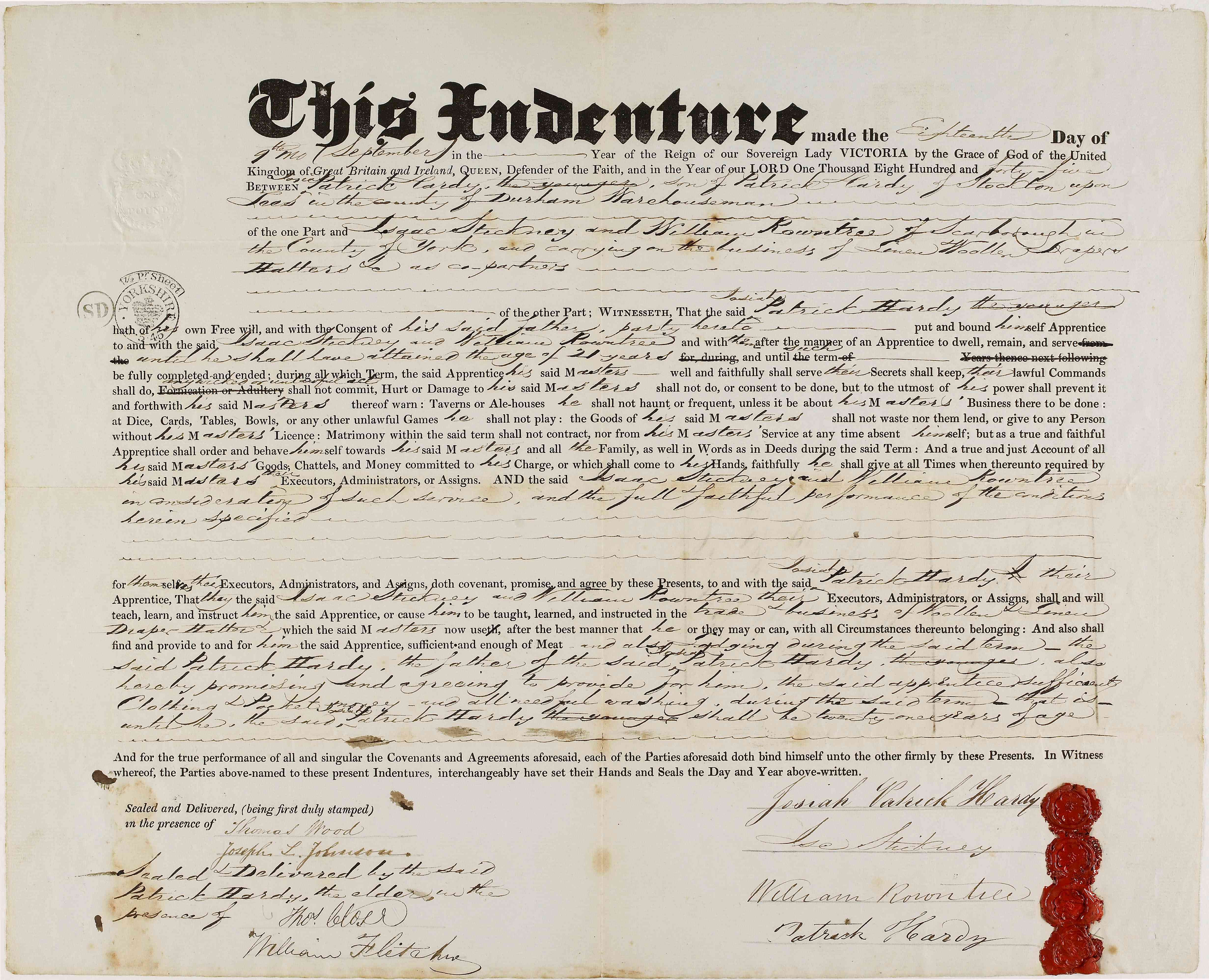 We hold a small collection of Quaker birth, marriage, and apprenticeship certificates, including the apprenticeship indenture of Josiah Patrick Hardy bound to Isaac Stickney and William Rowntree of Scarborough, linen woollen drapers & hatters, on 18 September 1845.