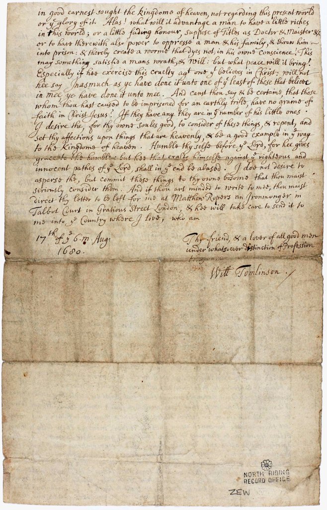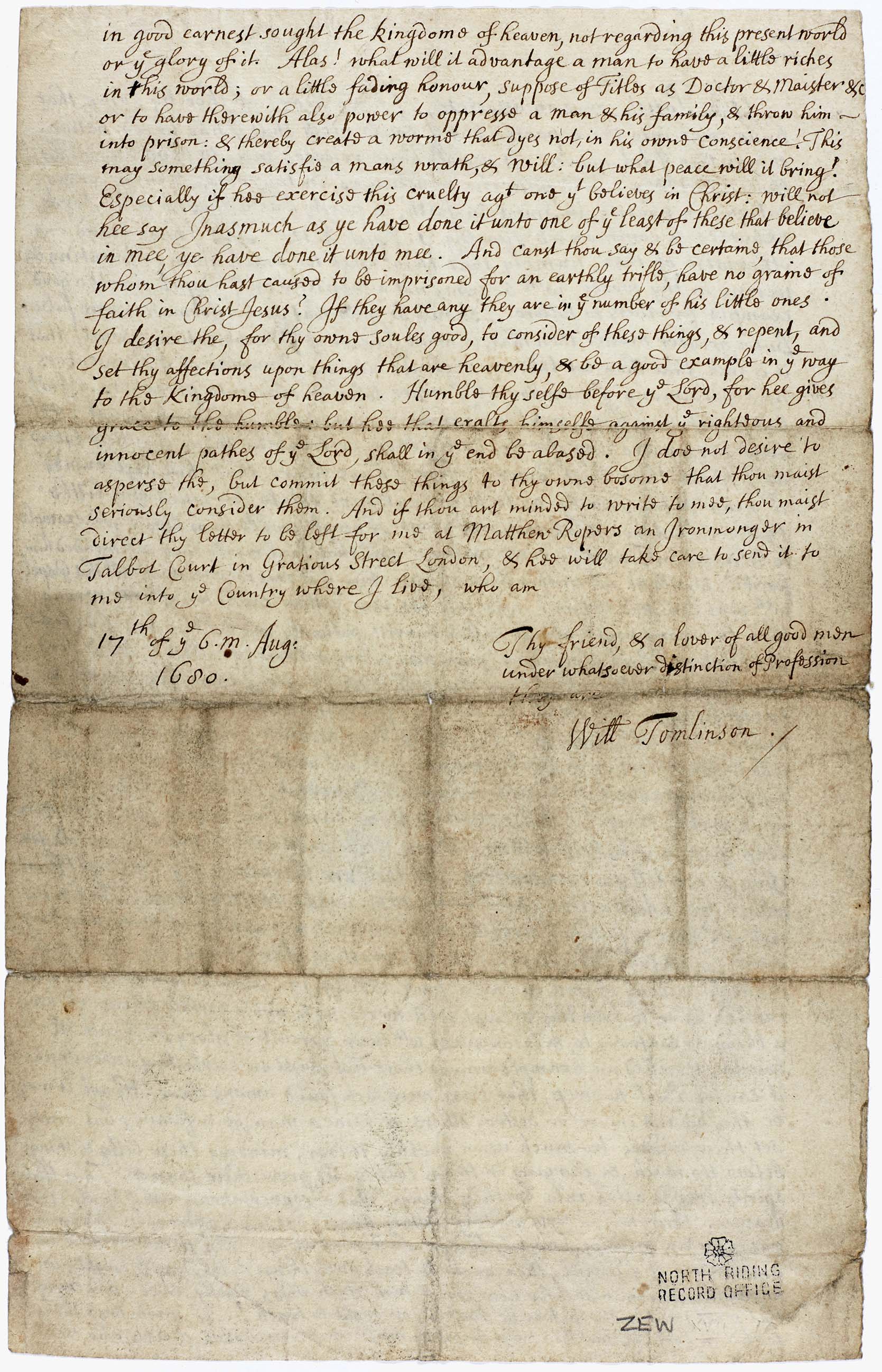 Equality as a virtue is also strongly evident in Friend William Tomlinson’s letter of August 1680 to the Reverend George Parish, regarding the latter’s harsh treatment of Quakers in the parish of Helmsley (ZEW X, see below). Having berated the Reverend for using his position of power in society to oppress, Tomlinson signs his letter under the maxim: “Thy friend, and a lover of all good men under whatsoever distinction of profession they are”.