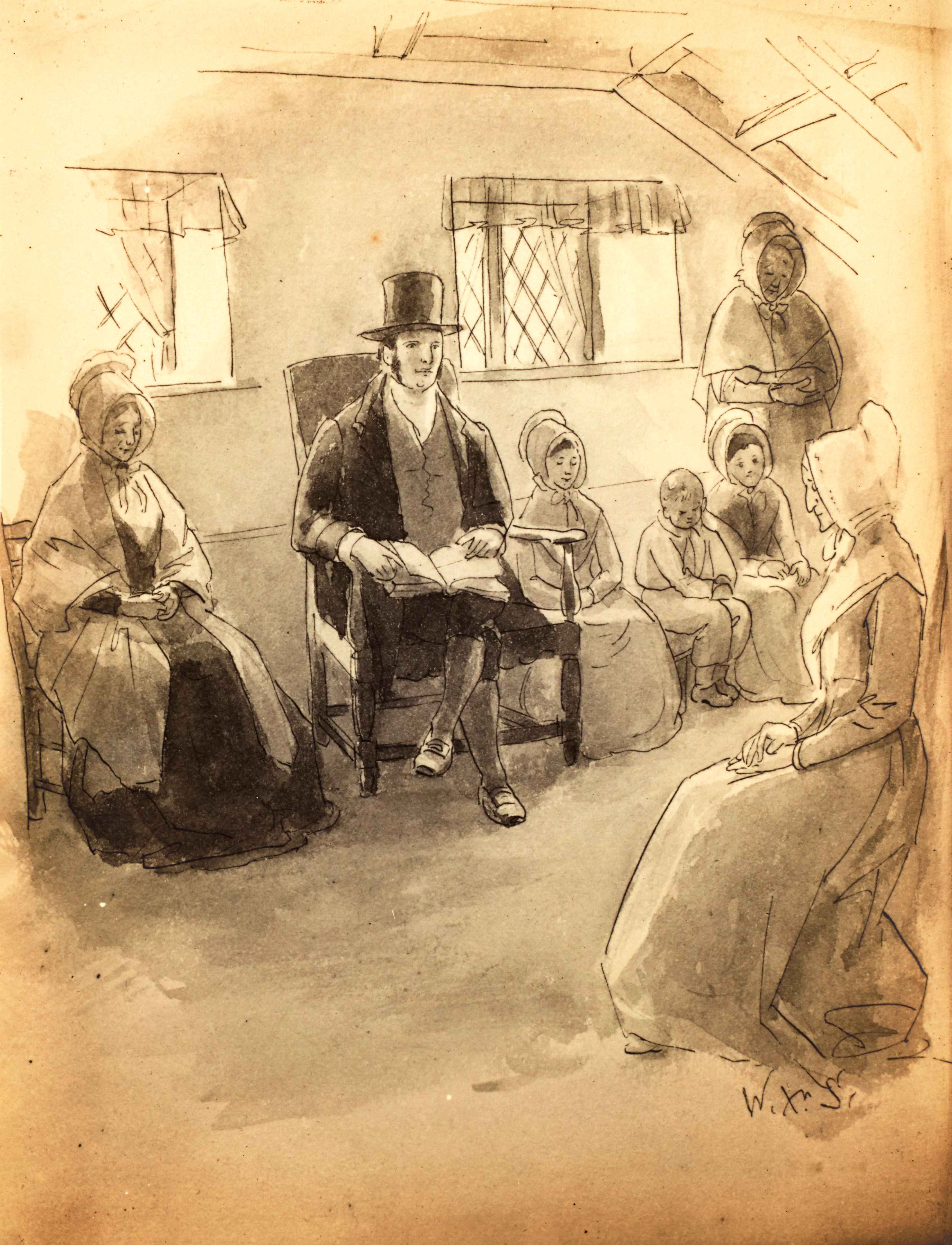 Illustration of Friends meeting, from “In the Days of Old: A Quaker Child, by ‘Granny’”, by Isabella Harris (née Tindall), not dated, c.19th century [ZYZ]