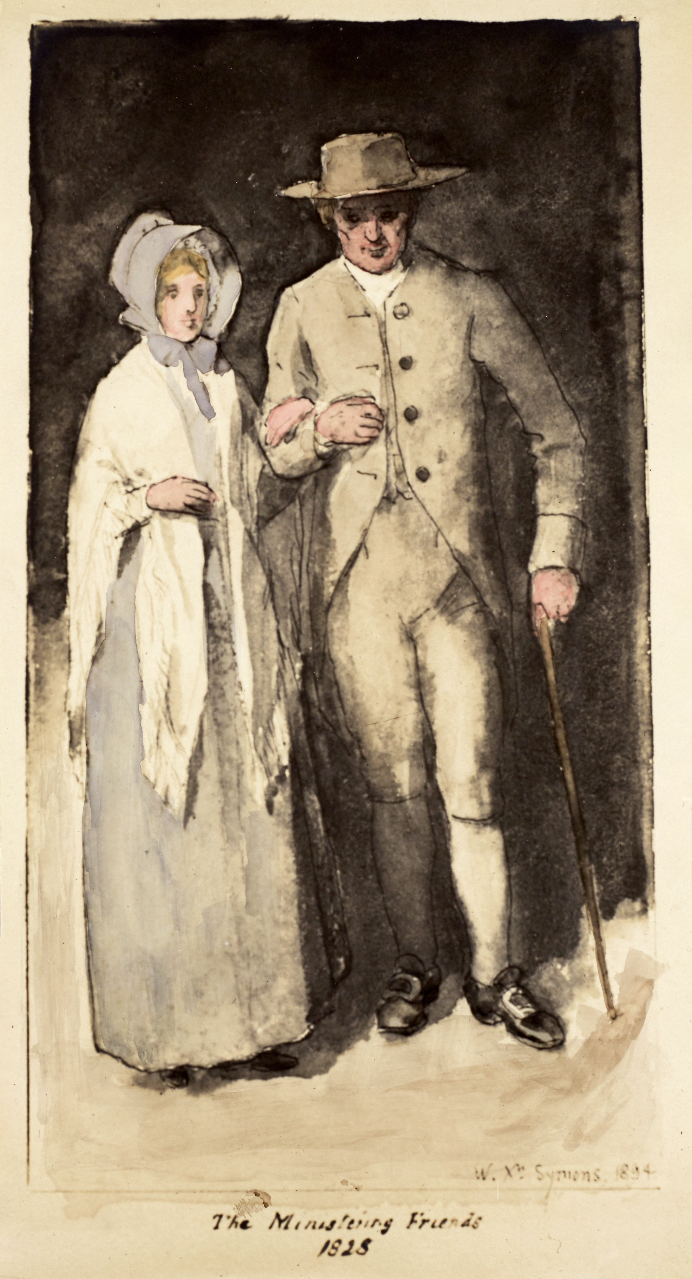 ‘The Ministering Friends, 1828’, an illustration from “In the Days of Old: A Quaker Child, by ‘Granny’”, a loose-leaf typescript memoir by Isabella Harris (née Tindall), no date [ZYZ]