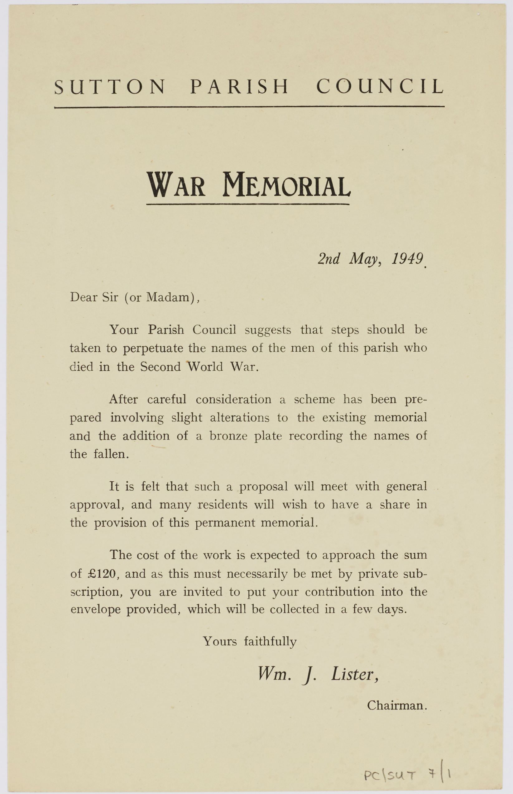 PC/SUT 7/1 Appeal letter for Sutton in Craven Parish Council