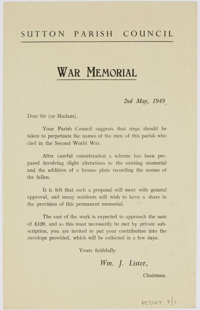 In May, 1949 the residents of Sutton in Craven received a printed letter and envelope from the Parish Council, inviting them to contribute to the addition of a bronze plate to their existing war memorial, which would record the 15 names of the fallen from the Second World War.