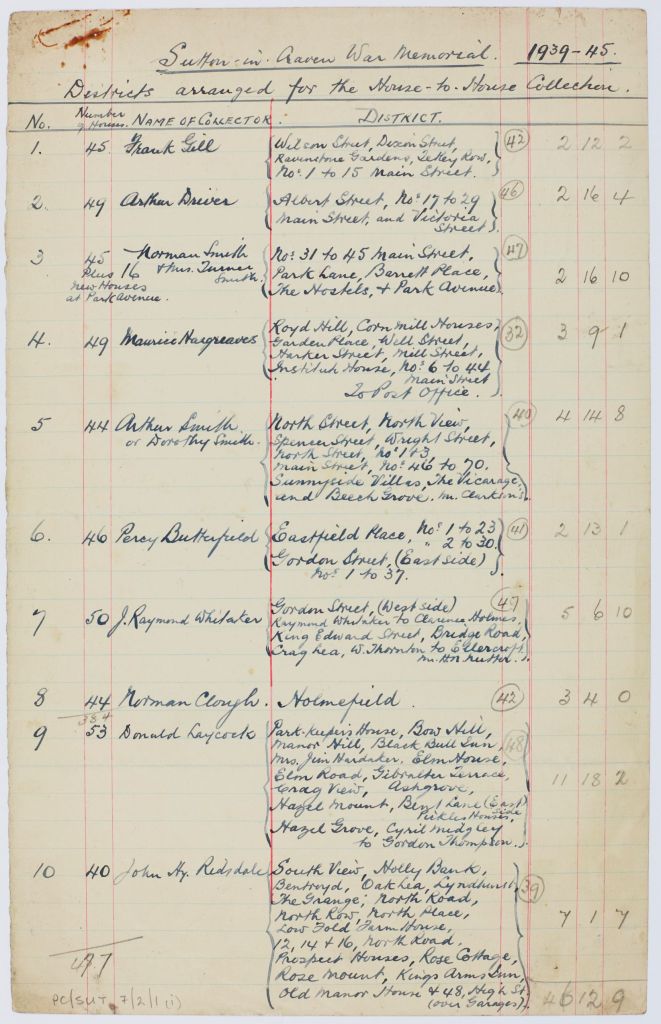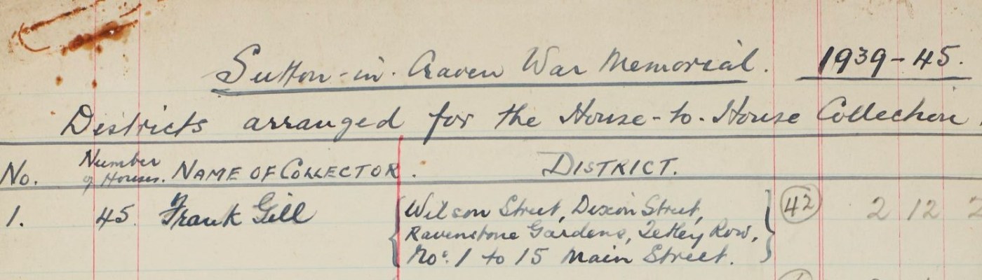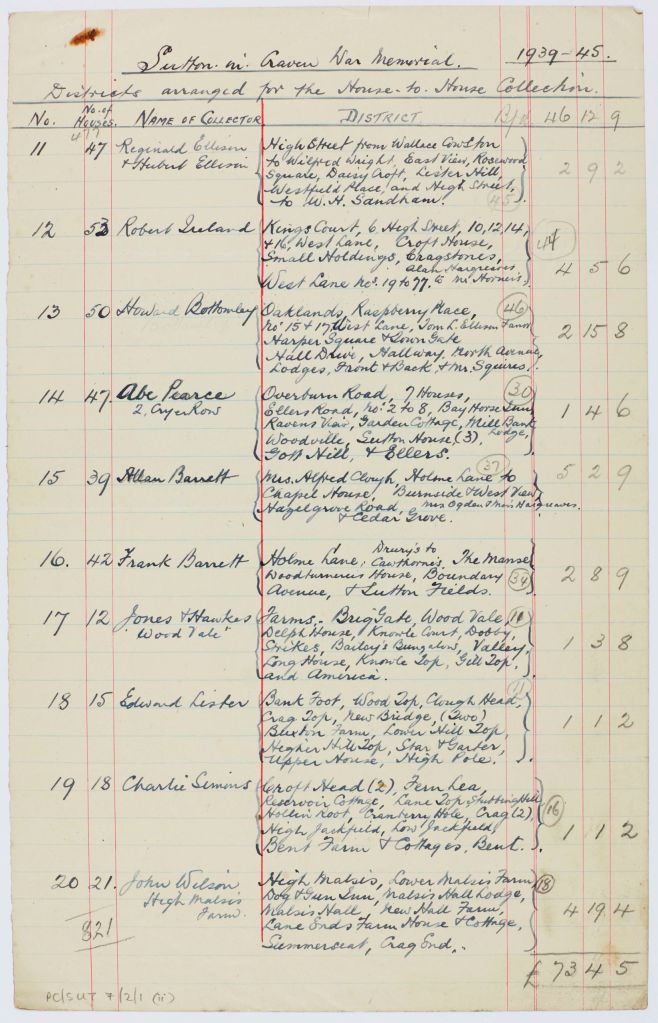 Records of Parish Councils are often useful for researching village events. A minute book of the Sutton in Craven Parish Council (PC/SUT 1/4) shows that from 1949, meetings to discuss the proposed war memorial plaque were chaired by Richard M Bateman of Lyndhurst, whose father Lieutenant Colonel C.M. Bateman DSO, 6th Battalion West Riding Regiment, had unveiled the original memorial in 1921. A meeting of the Parish Council agreed that a house-to-house appeal for subscriptions for a memorial tablet should be launched. A surviving hand-written document shows that the village was divided into districts, to which collectors were assigned. Most districts included between 40 and 50 properties, though collectors who covered the more remote outlying areas covered fewer properties. The team aimed to visit a total of 821 houses. The total amounts collected from each district have been noted in pencil. The total collected by this house-to-house collection was £73-4-5.