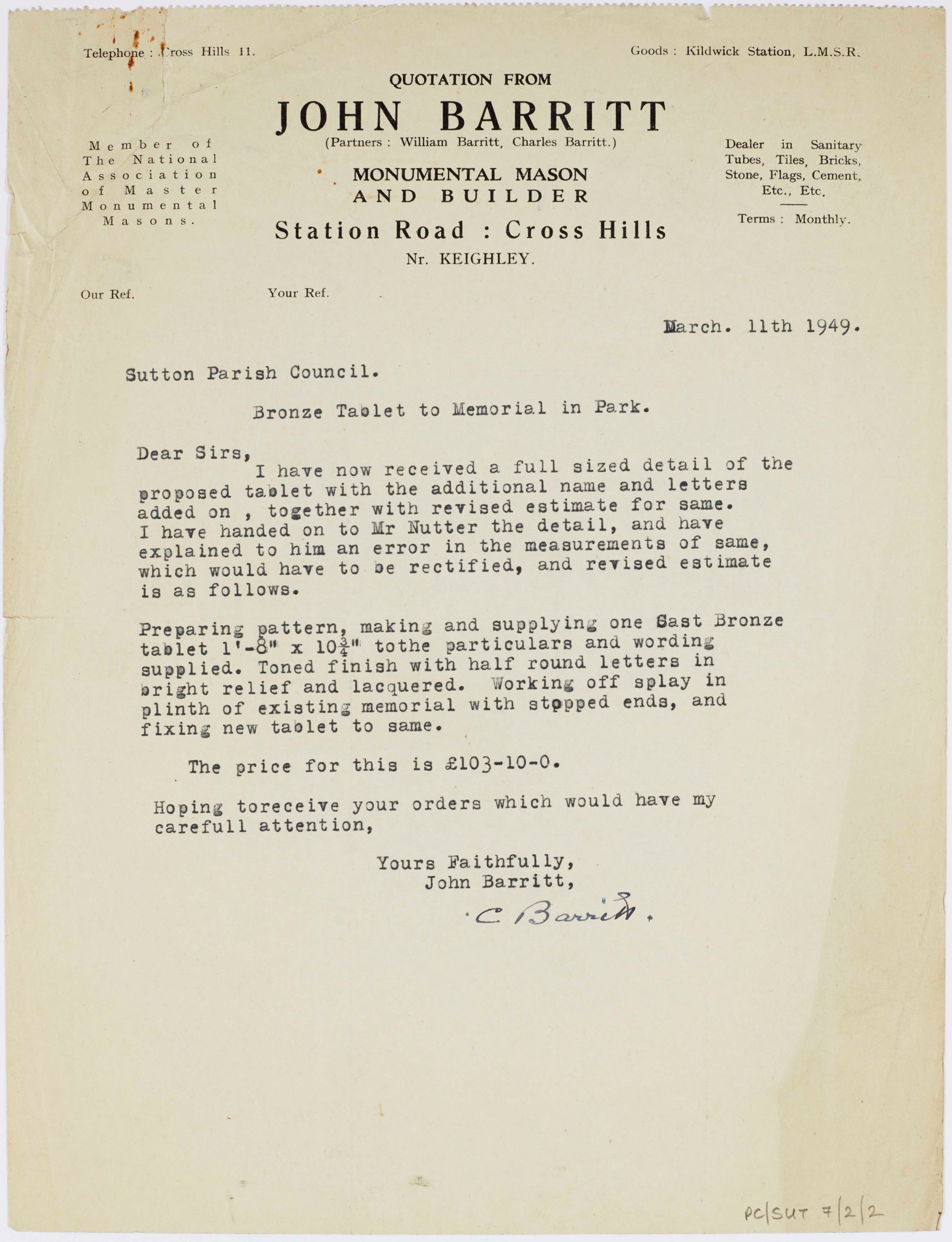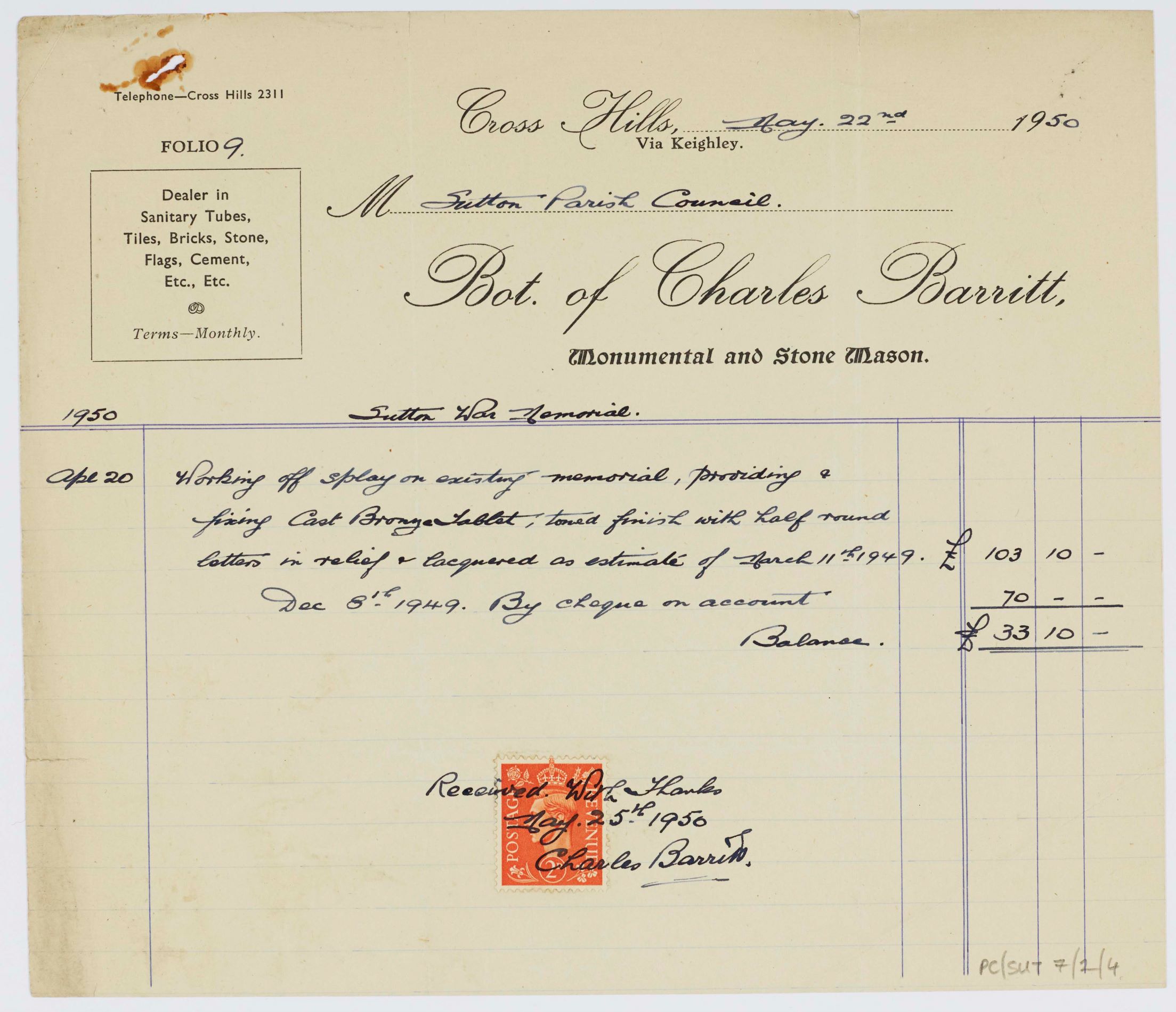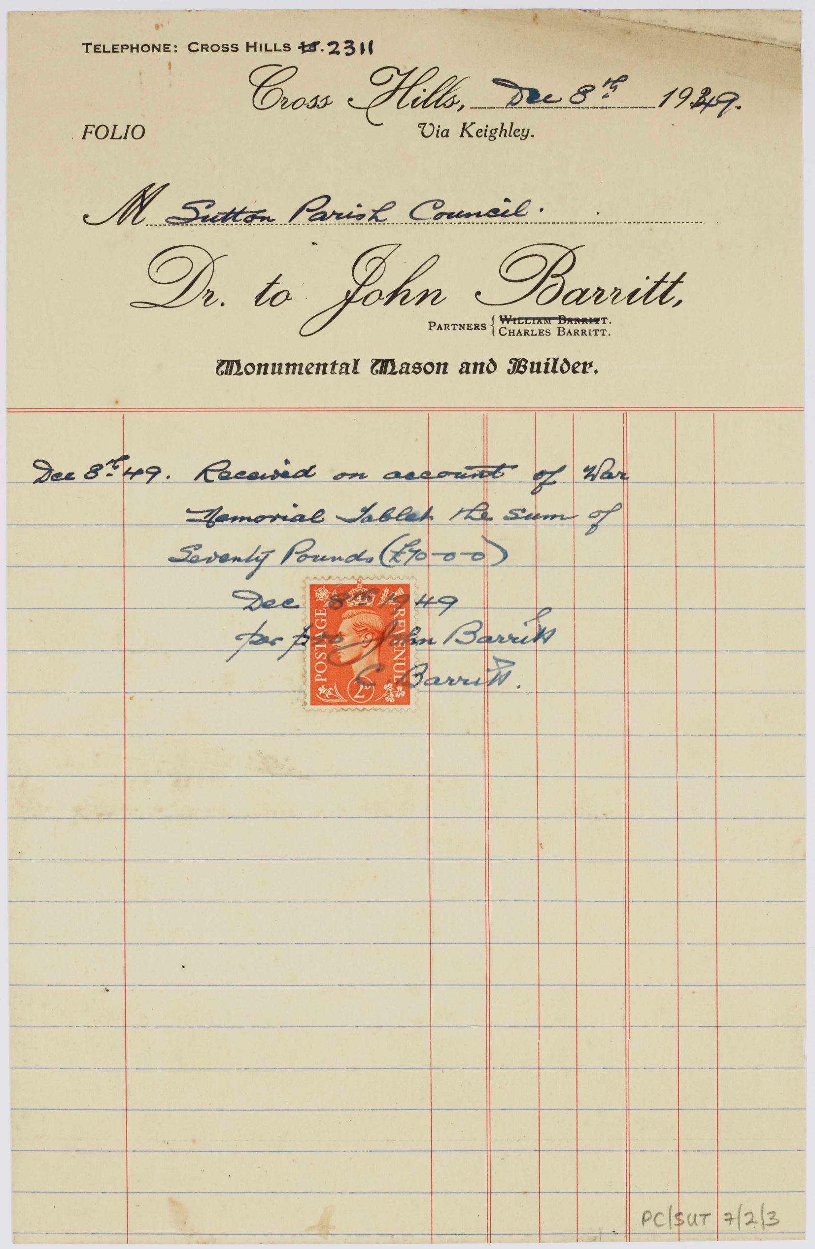 Records from Sutton-in-Craven Parish Council contain correspondence from monumental mason and builder John Barritt of Cross Hills. The Council minutes record that his quote for the work at £103-1-0 was accepted. Receipts show that an initial payment of £70-0-0 was made on 8th December 1949, which seems to have been covered by the house-to-house collection. The balance of £33-10-0 was paid in May 1950. The total cost roughly equates to around £3200 today.