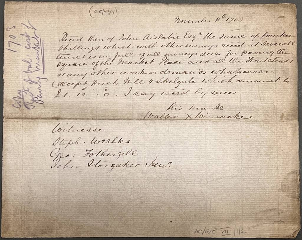 Copy receipt for the sum of 14 shillings received by Walter Wimacke from John Aislabie as the final instalment of the £62 [equivalent to over £12,000 today] that he was paid for paving the Market Square, Ripon, 11 November 1703 (19th-century copy) [DC/RIC VII 1/1/2]