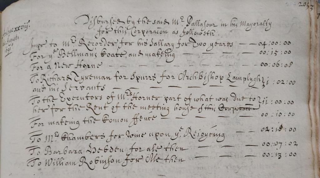 Extract from the Ripon Corporation Minute Book, 1691 recording expenditure ‘For a New Horne’ [DC/RIC II 1/1/2]