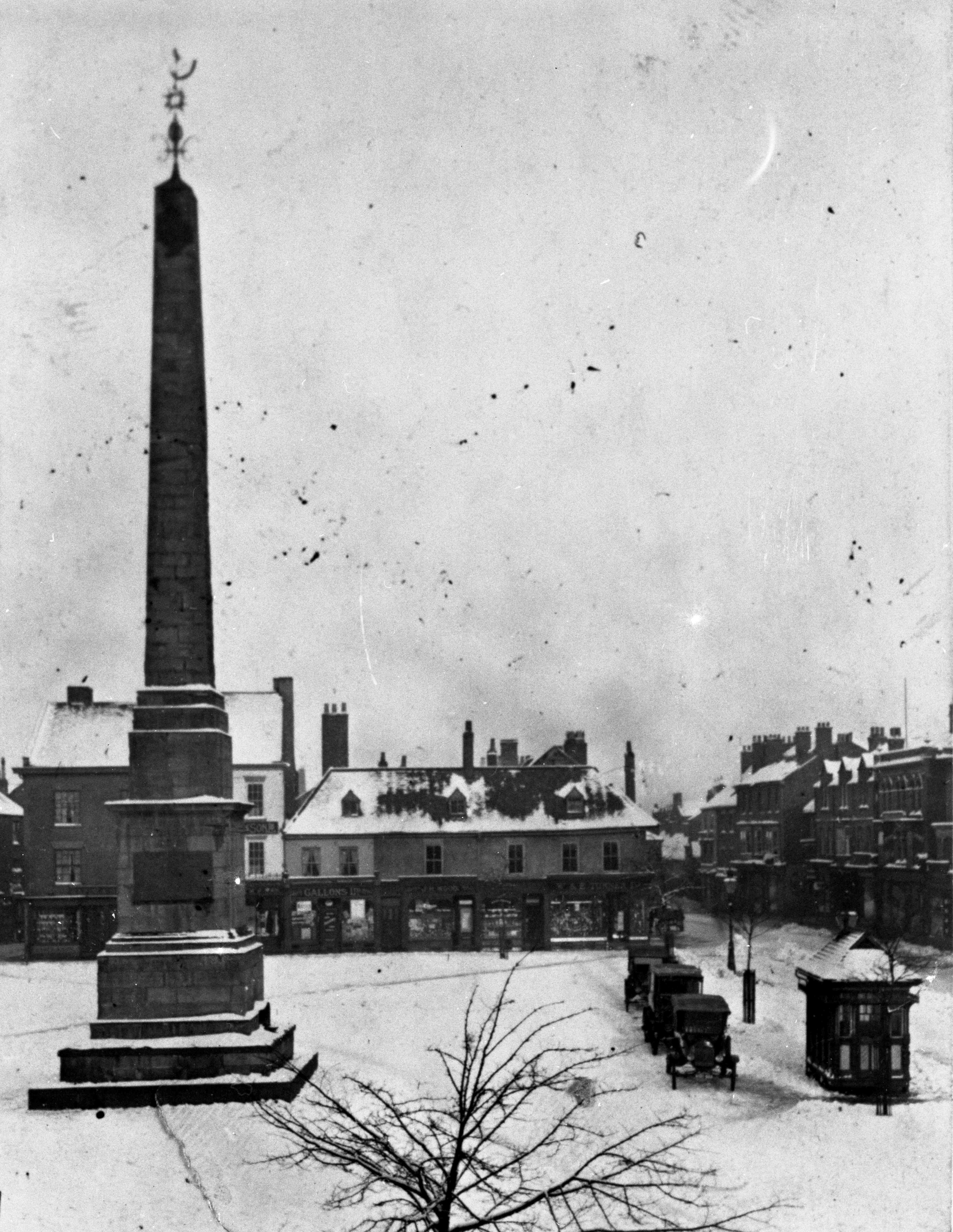 - Right: Photograph of Ripon obelisk in the snow, undated [Ripon Re-Viewed collection EF446-141607]