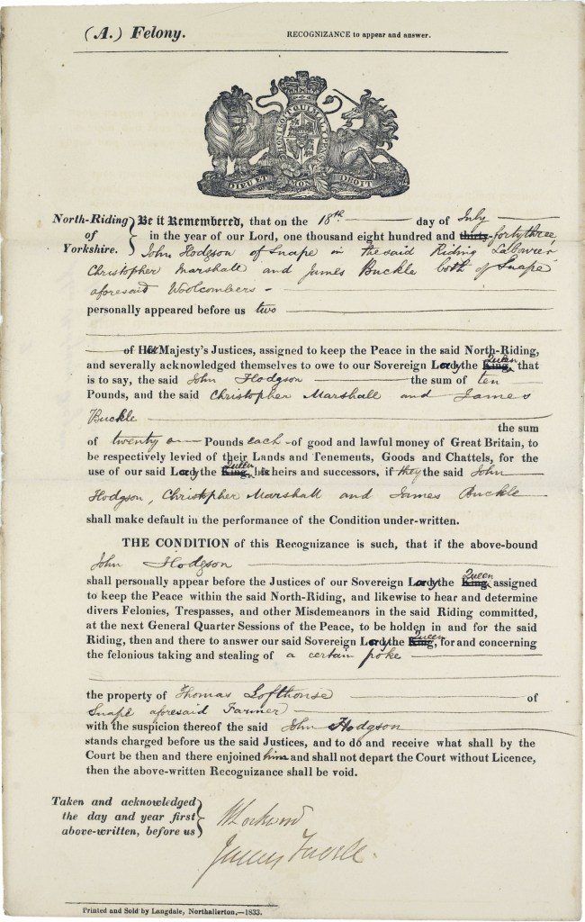 This recognizance was entered into by John Hodgson, a labourer, and Christopher Marshall and James Buckle, both woolcombers, all of Snape. John Hodgson is accused of stealing a poke (bag) from Thomas Lofthouse. The total sum at stake is £50.