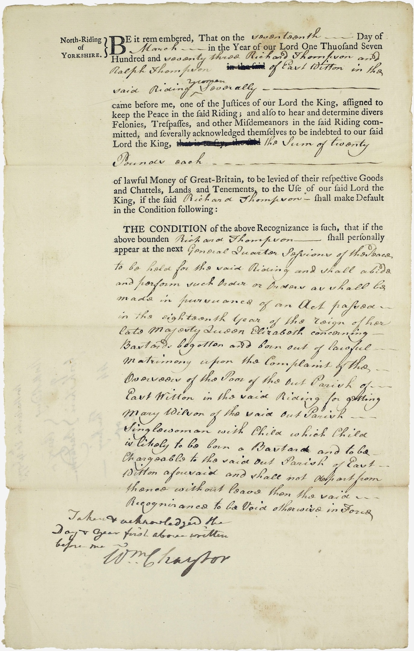 This recognizance (a bond or obligation) relating to bastardy was entered into by Richard Thompson and Ralph Thompson, yeomen of East Witton. Richard Thompson had to appear at Quarter Sessions to answer in relation to a child of Mary Wilson. If Richard failed to appear at Quarter Sessions he and his surety would forfeit £20 each.