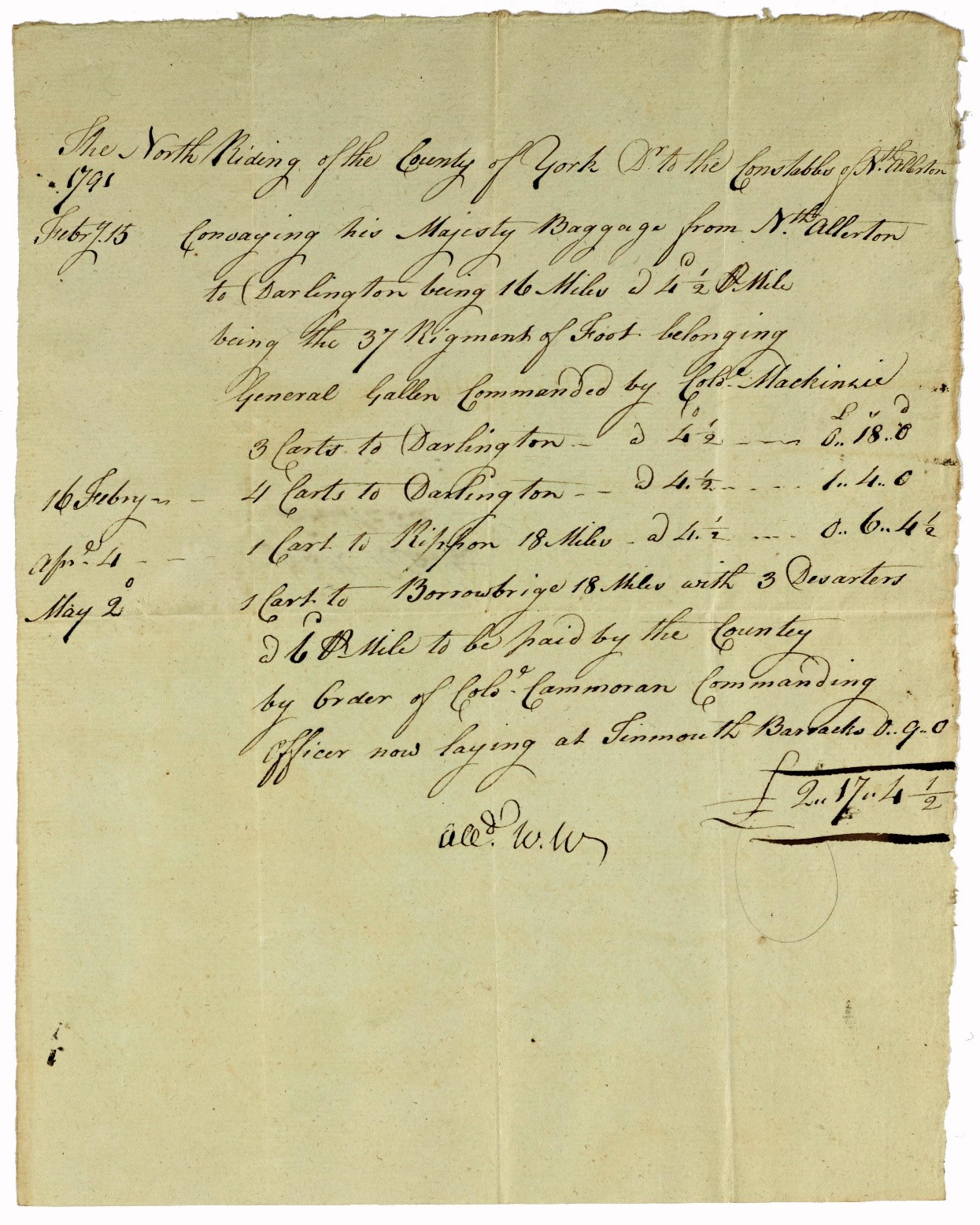 Bill of expenses of the constables of Northallerton for conveying the baggage of the 37th Regiment of Foot, belonging to General Gallen and commanded by Colonel Mackinzie, from Northallerton to Darlington on 15 and 16 February, and from Northallerton to Ripon on 4 April at a rate of 4½ pence per mile; and for taking three deserters from Northallerton to Boroughbridge on 2 May 1791, to be paid by the County by order of Colonel Cammoran commanding officer, now at Tinmouth barracks.