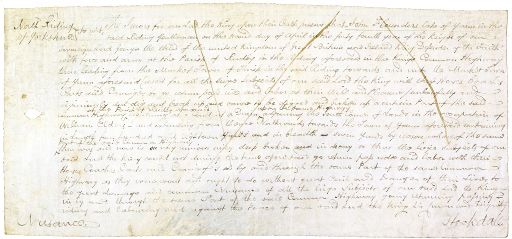 Bill of indictment of John Flounders late of Yarm, gentleman, for digging up part of the highway from Thirsk to Yarm in the parish of Rudby, from a conduit or drain on the highway adjoining the south corner of lands occupied by William Elders and extending northward towards the town of Yarm, being 418 yards in length and 7 yards in breadth. Offence committed at the parish of Rudby on 2 April 1804. Endorsed (written on the back) with names of witnesses and “not found“ [QSB 1804 4/6/3].
