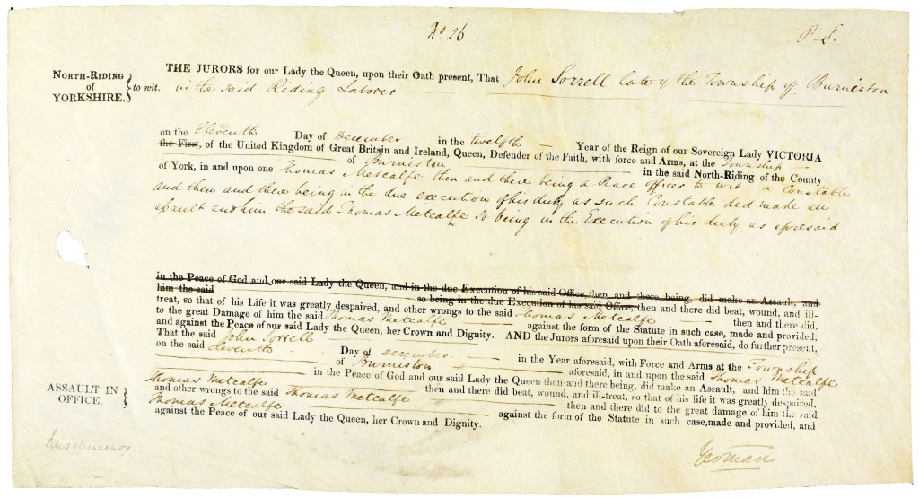 Bill of indictment of John Sorrell late of the township of Burniston labourer for assaulting Thomas Metcalfe a constable in the execution of his duty. Offence committed at the township of Burniston on 11 December 1848. Endorsed with names of witnesses and “true bill“ [QSB 1849 3/6/24].