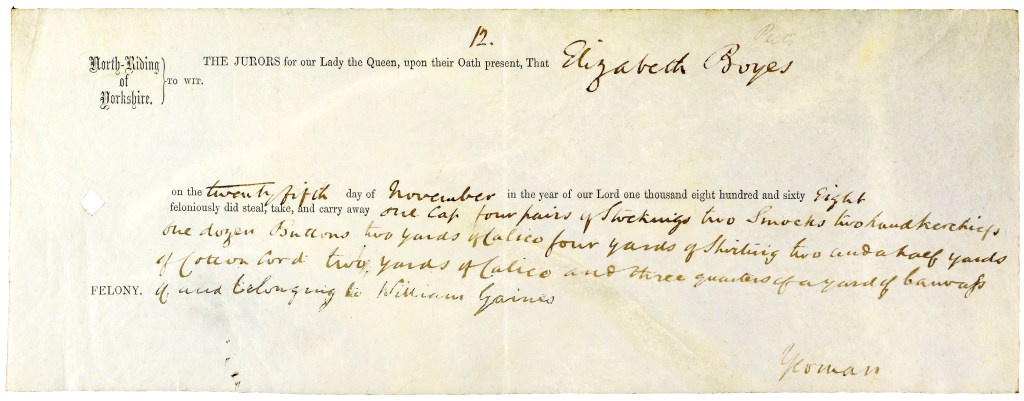 Additional examples of cases heard at the North Riding Quarter Sessions, including that of Sophia Constable, feature in other blog posts. A number of stories of criminal women featured in Quarter Sessions’ records, have been explored in previous posts.
