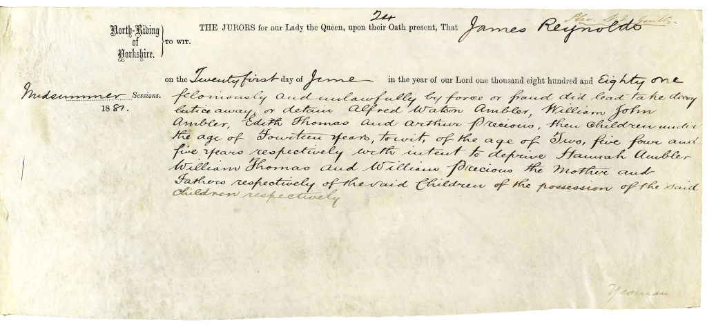 Bill of indictment of James Reynolds for enticing away Alfred Watson Ambler aged two, William John Ambler aged five, Edith Thomas aged four, and Arthur Precious aged five, with intent to deprive Hannah Ambler, William Thomas and William Precious, their respective parents, of the possession of the children. Offence committed on 21 June 1881. Endorsed with names of witnesses and “true bill“ [QSB 1881 3/6/18].