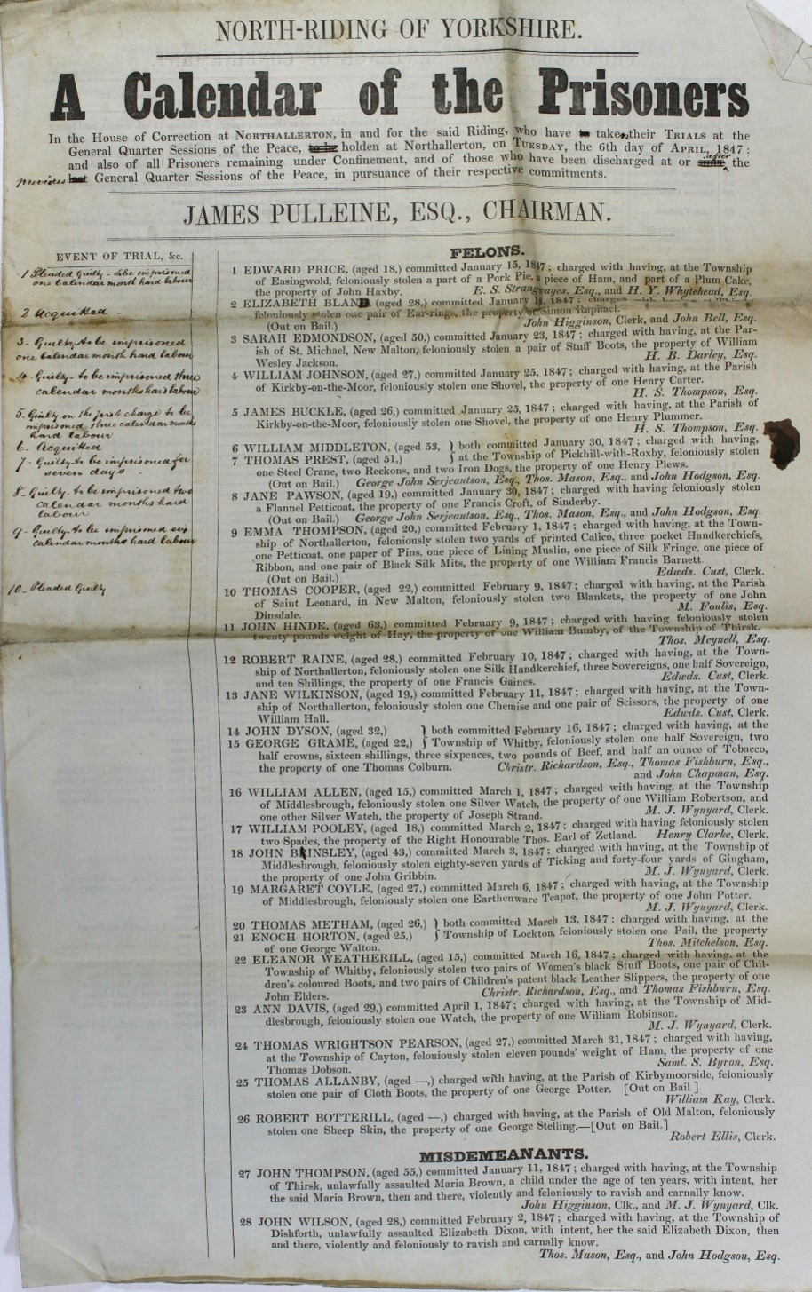 A Calendar of the Prisoners in the House of Correction at Northallerton, Easter 1847 [QSB]