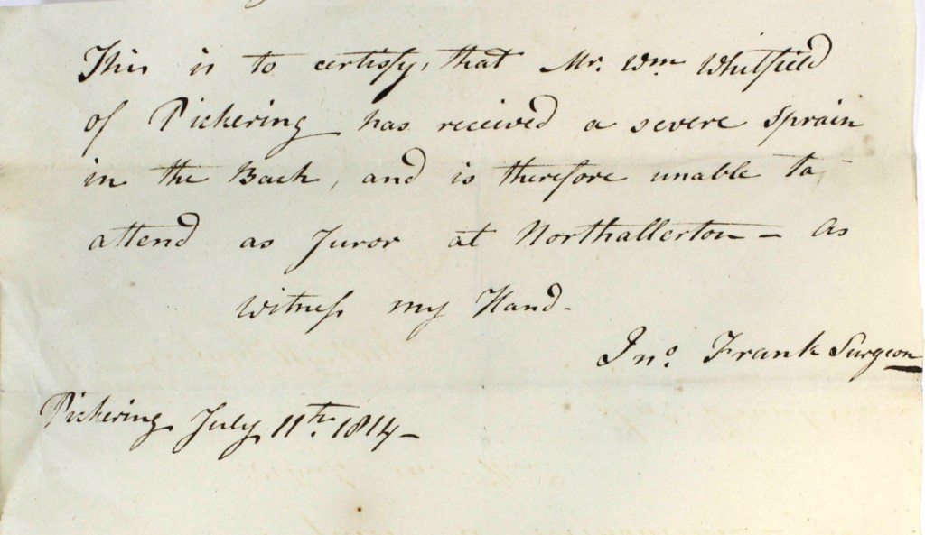 If a potential juror was ill, a certificate could be issued by a surgeon in order to excuse him from service. This certificate, signed by John Frank, surgeon, tells us that William Whitfield of Pickering has received a severe sprain in the back and, as such, is unable to act as juror.