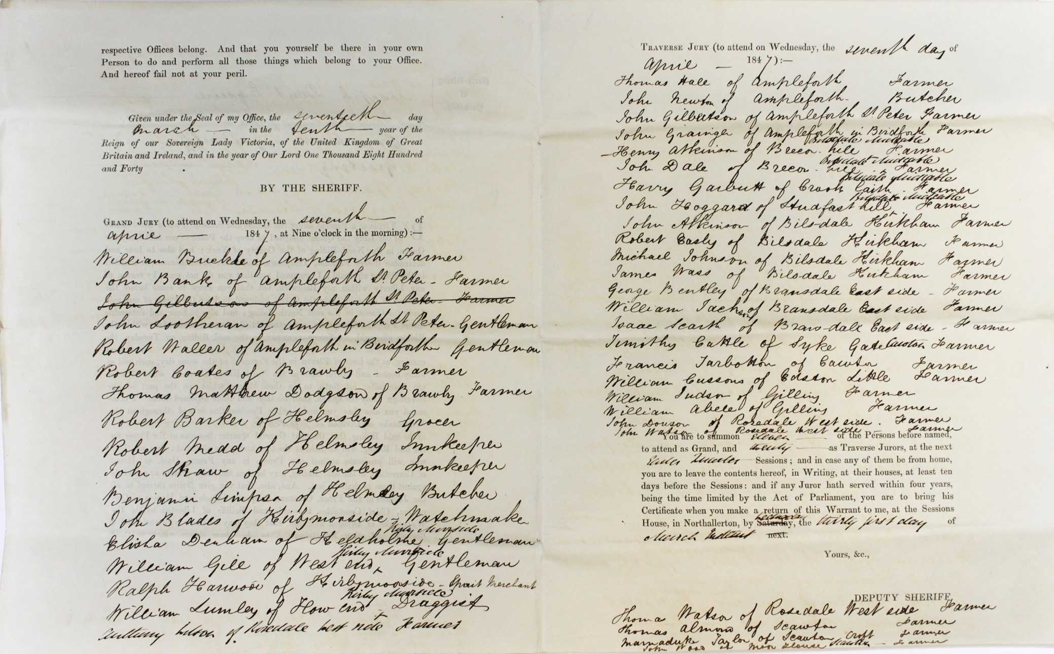 In addition, there would also be juries of local residents. These jurors would be summoned to attend the Quarter Sessions by the sheriff, who was instructed to do so by the Justices of the Peace, who would issue a precept (see above example top left).