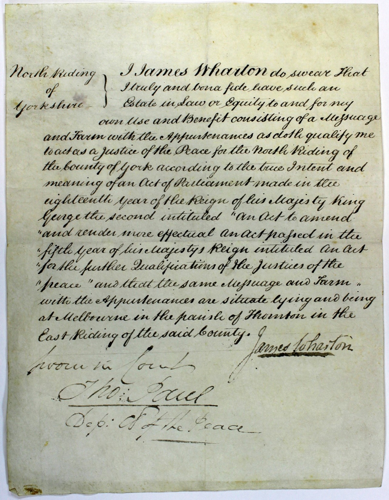 In this Oath, James Wharton swears that he is the owner of an estate, consisting of a messuage and a farm, which makes him eligible to be a Justice. This property was situated at Melbourne in the parish of Thornton in the East Riding of the County of York.