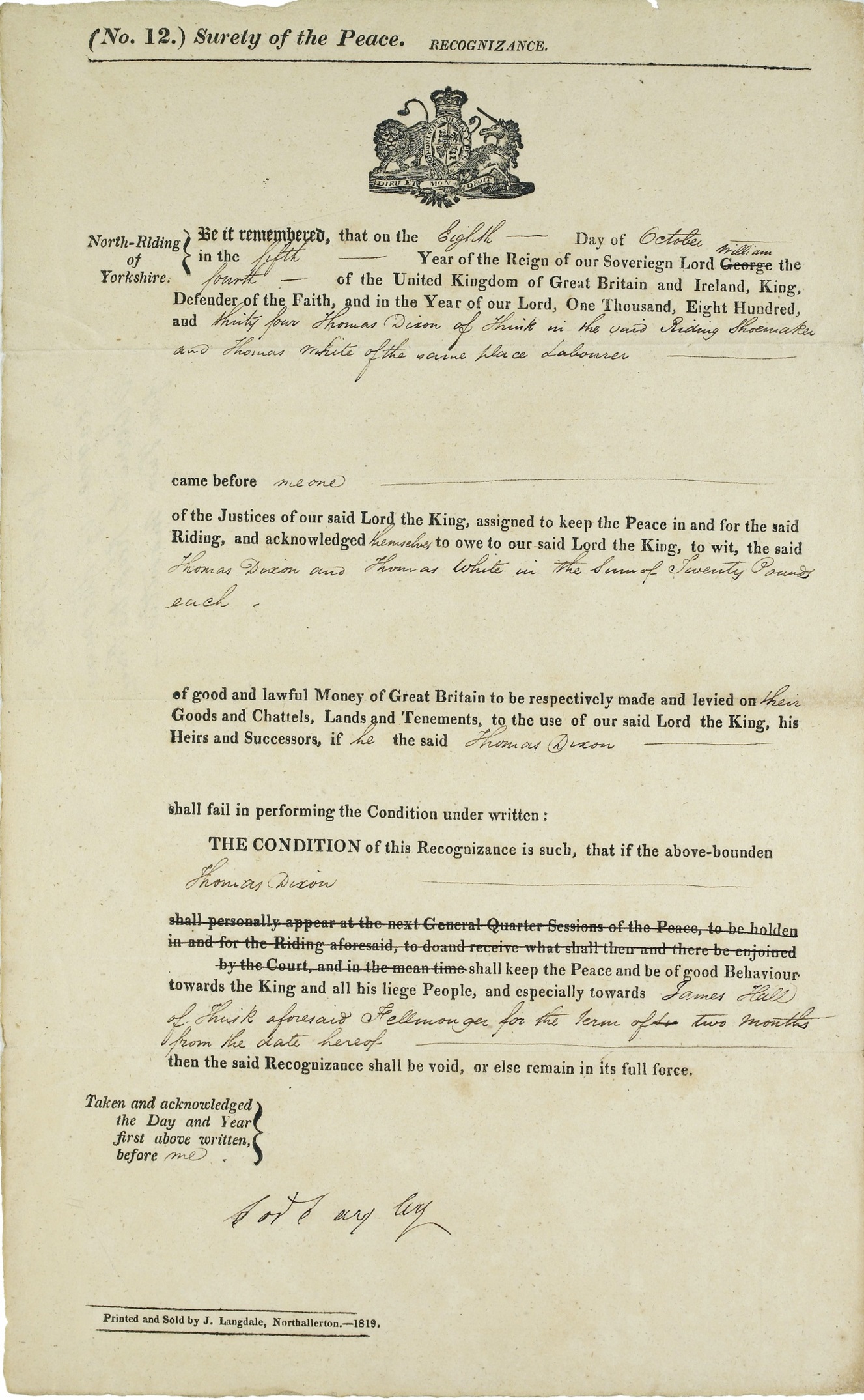 This particular recognizance was entered into by Thomas Dixon, a shoemaker, and Thomas White, a labourer, both of Thirsk, who pledged the sum of £20 each that Dixon would keep the peace and be of good behaviour for a term of two months. This applied especially to his behaviour towards James Hall, a fellmonger of Thirsk. If Thomas failed to keep the peace, then £20 each would be forfeit.