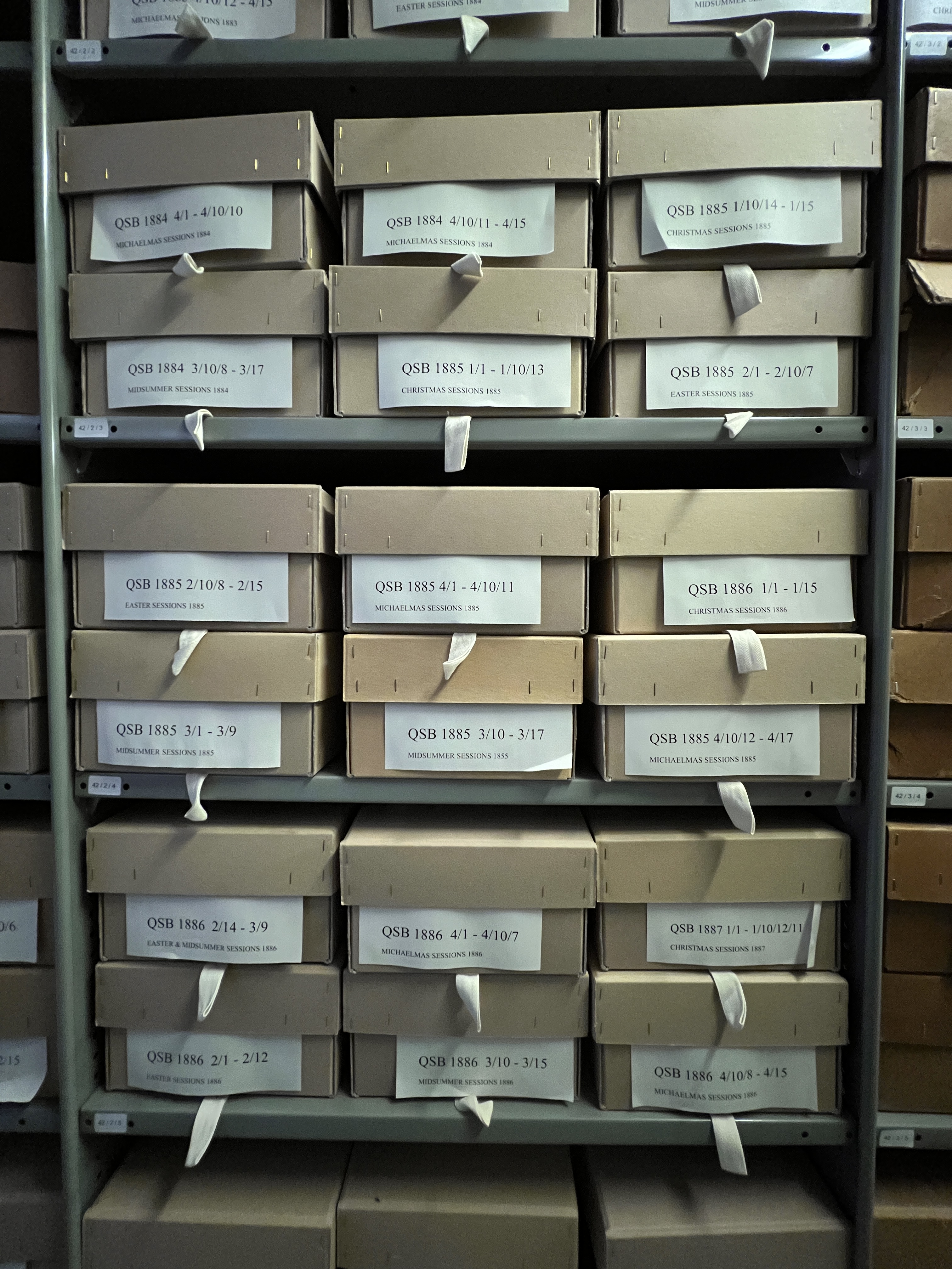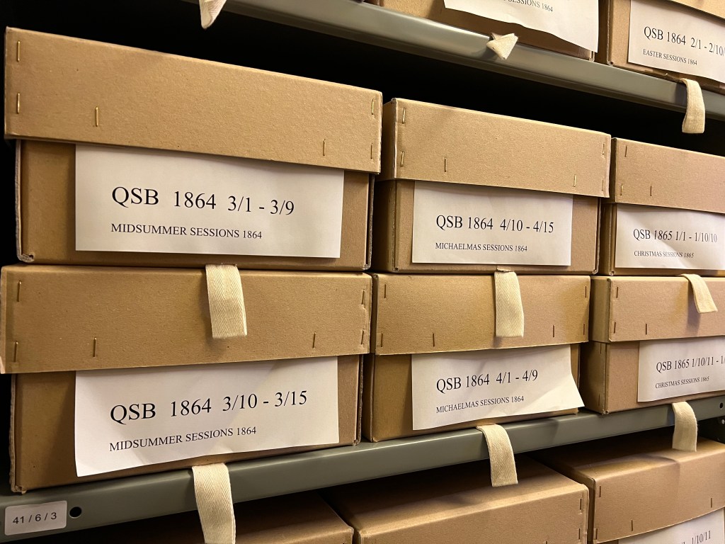 North Riding Quarter Sessions’ working papers boxed and labelled in our strong room according to their respective year, quarter and sub-section reference number [QSB 1864/3 Midsummer and QSB 1864/4 Michaelmas]