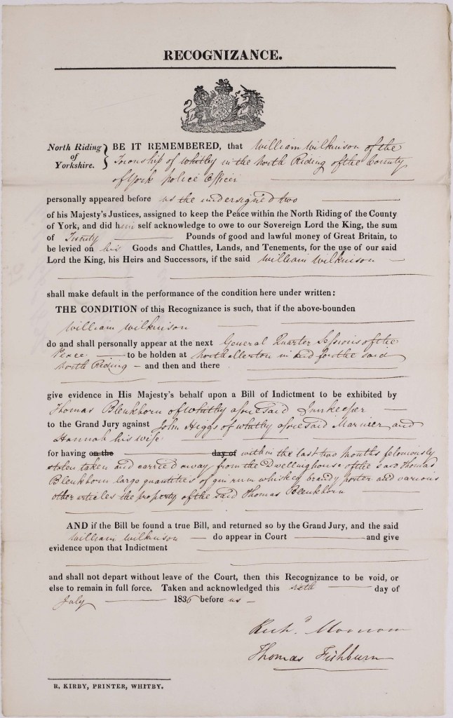 William Wilkinson, a police officer of Whitby, has entered into this recognizance to give evidence against John Higgs, a mariner, and Hannah Higgs his wife, both of Whitby, who will stand trial accused of stealing a large quantity of alcohol from Thomas Blenkhorn an innkeeper. William would lose £20 if he failed to appear.